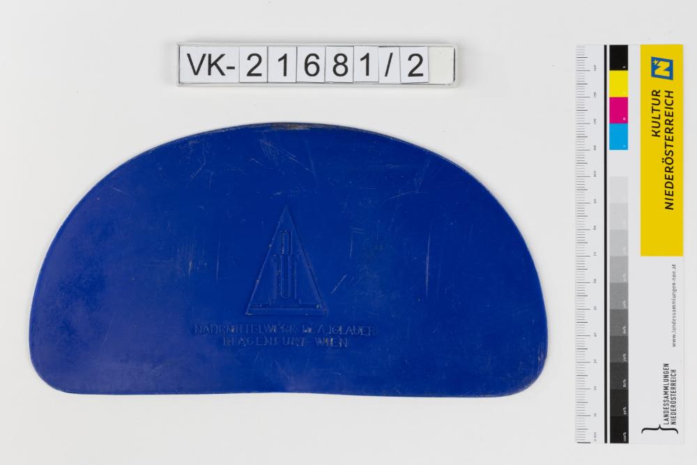 Einseitig rund verlaufende Teigkarte aus blauem Kunststoff mit Markenzeichen und Beschriftung: "NÄHRMITTELWERK Dr. A. IGLAUER KLAGENFURT-WIEN".