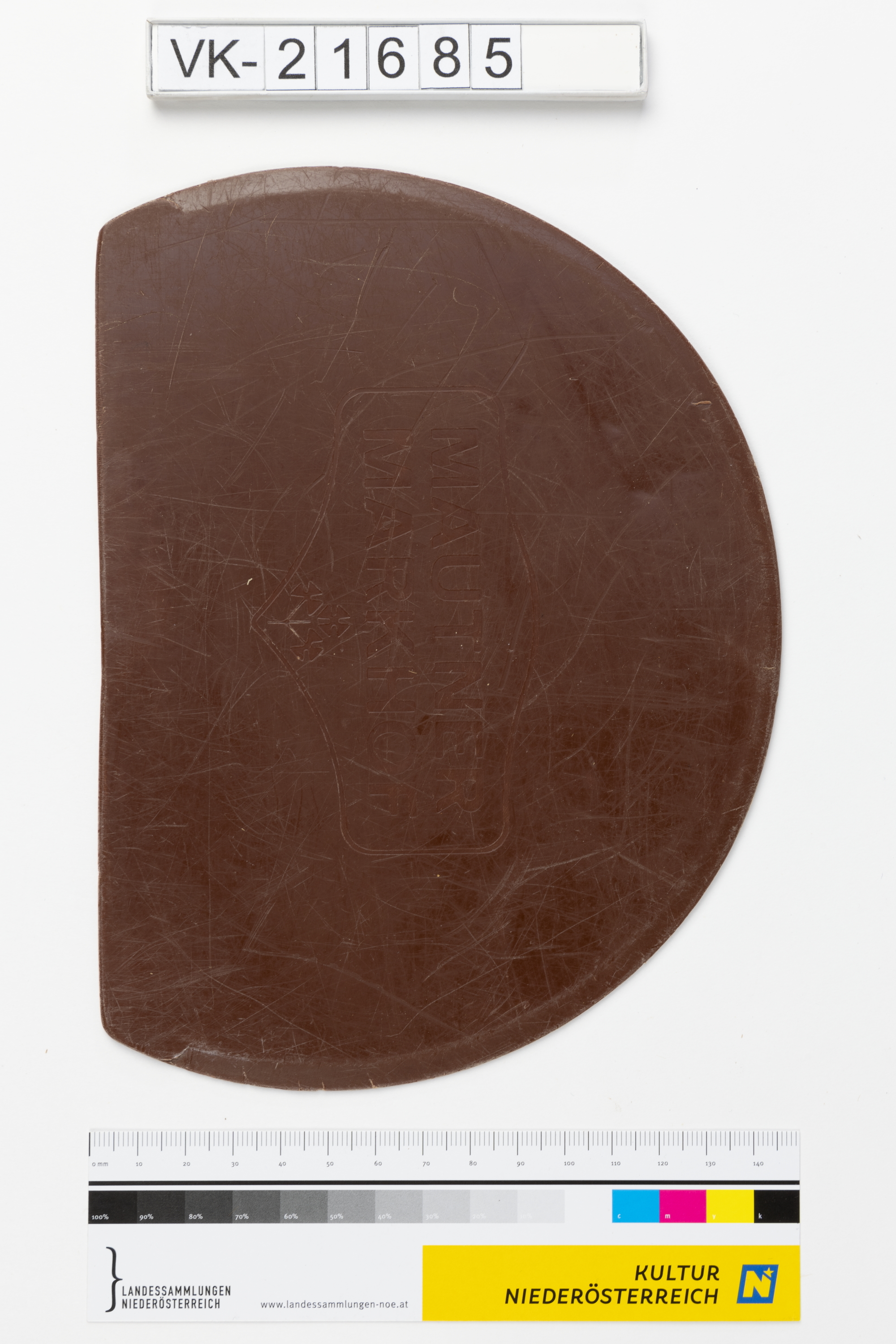 Annähernd halbkreisförmige Teigkarte aus braunem Kunststoff mit eingeformtem Markenzeichen "MAUTNER MARKHOF".