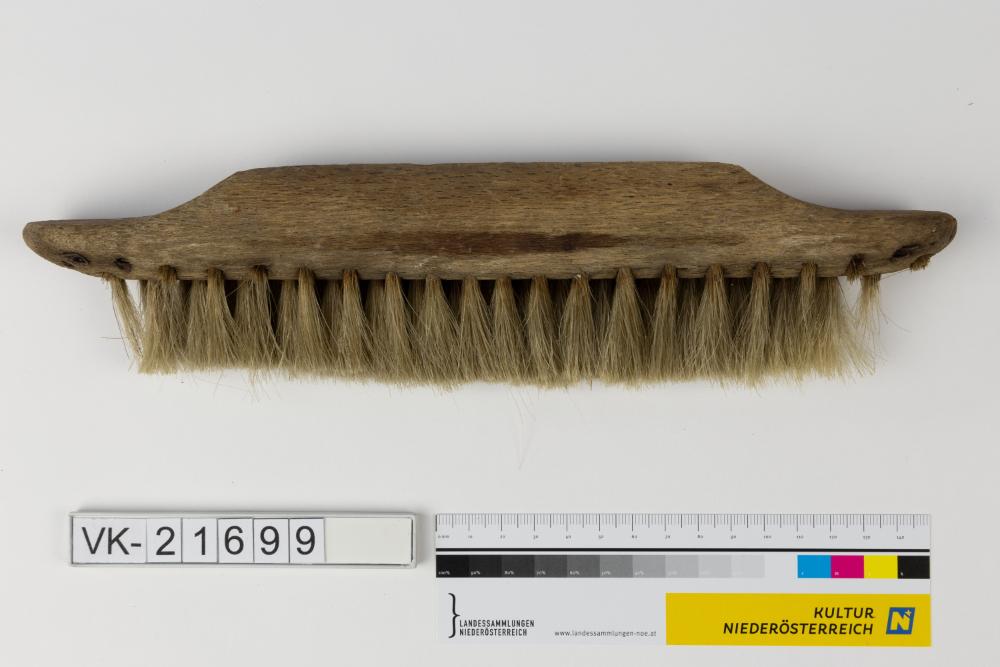 Bürste mit einem Holzgriff mit Griffmulden, besetzt mit hellbraunen Borsten.
