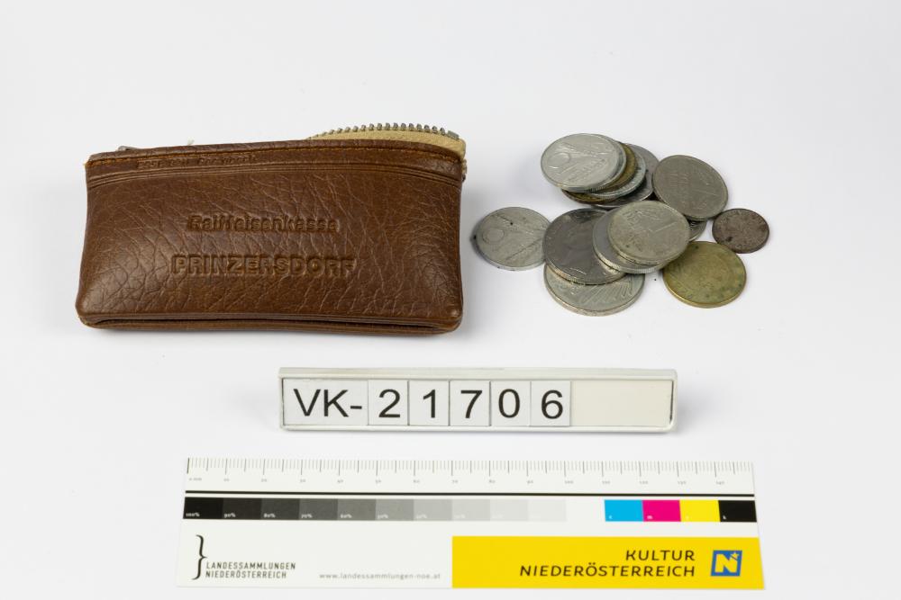 Kleine, braune, rechteckige Kunstledergeldbörse mit Metallreißverschluss, beidseitig geprägt mit einem Markenzeichen und "Raiffeisenkasse PRINZERSDORF". In der Geldbörse befindet sich ein Konvolut verschiedener Geldmünzen aus verschiedenen Ländern: Jugoslawien, Deutschland, Italien, CSSR, Münzen aus den westlichen Besatzungszonen Deutschlands.