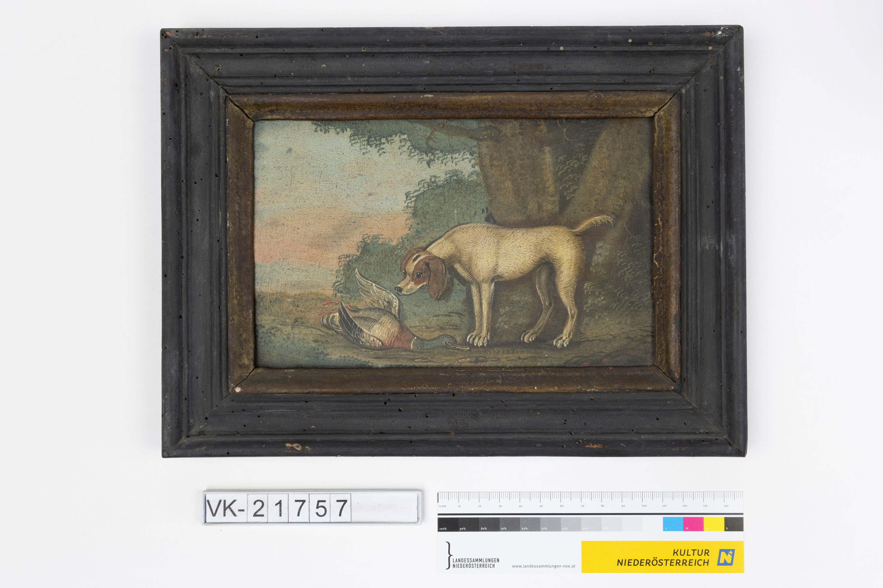 Ölbild auf einer Holzplatte in einem schwarzen Holzrahmen: Darstellung eines weißen Jagdhundes mit braunen Ohren neben einer erlegten Wildente.