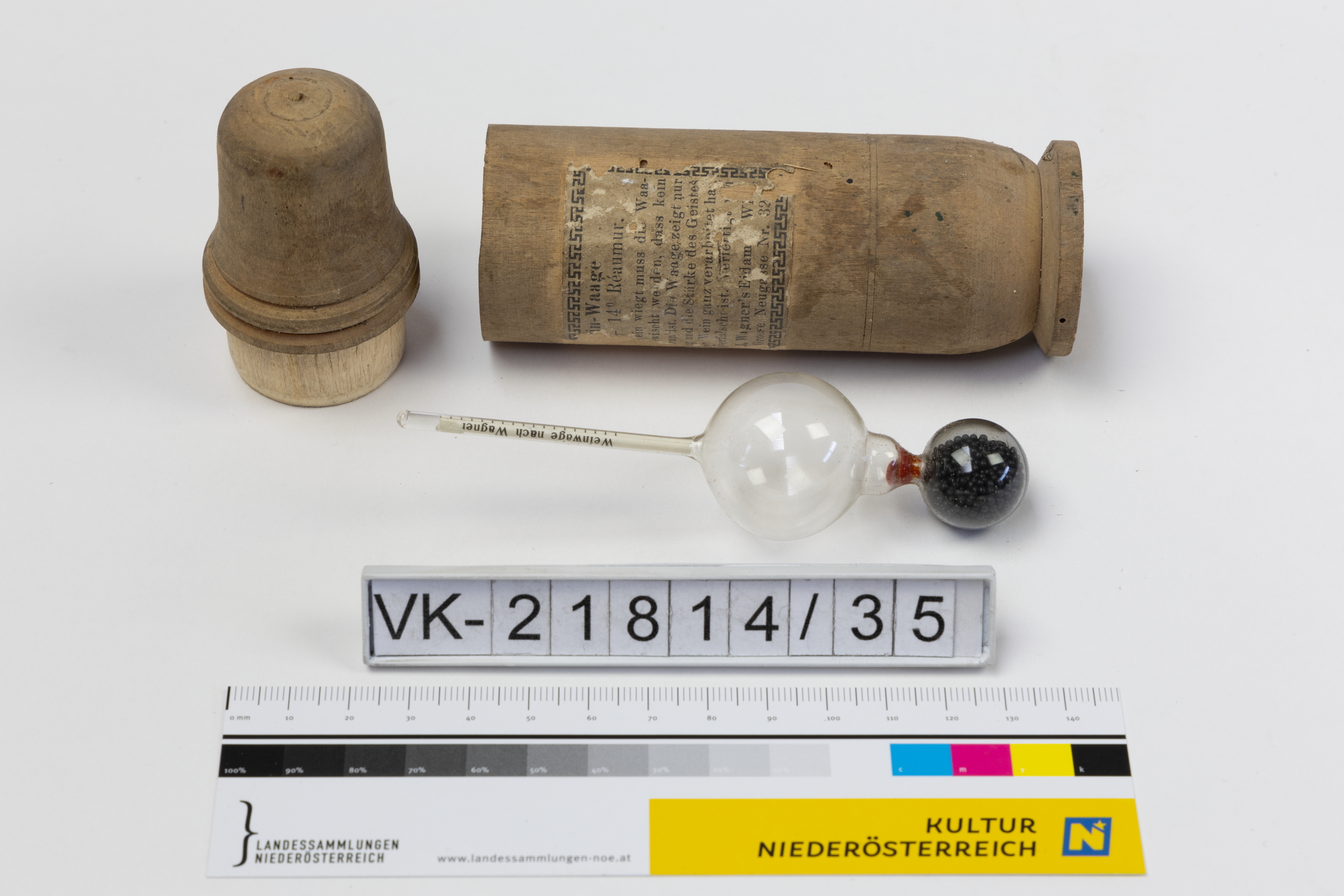 Weinwaage (VK-21814_35a, Aräometer) mit Behälter (VK-21814_35b) und Deckel (VK-21814_35c). Die Weinwaage besteht aus einem Glasröhrchen mit zwei Glaskugeln, von denen eine mit Metallkügelchen befüllt ist. In dem Röhrchen ist die Papierskala eingelegt, die Weinwaage hat einen annähernd zylindrischen Holzbehälter mit abgesetzter Fußzone und einem aufgesteckten Deckel. Auf dem Behälter ist ein Klebeetikett mit Angaben zur Verwendung der Waage und zum Hersteller.