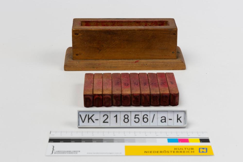 Holzständer (VK-21856a) als Halterung für zehn Ziffernstempel, von 0-9 (VK-21856b-k), am Boden ist ein roter Aufdruck: "Waffenhauptdepot Wien".