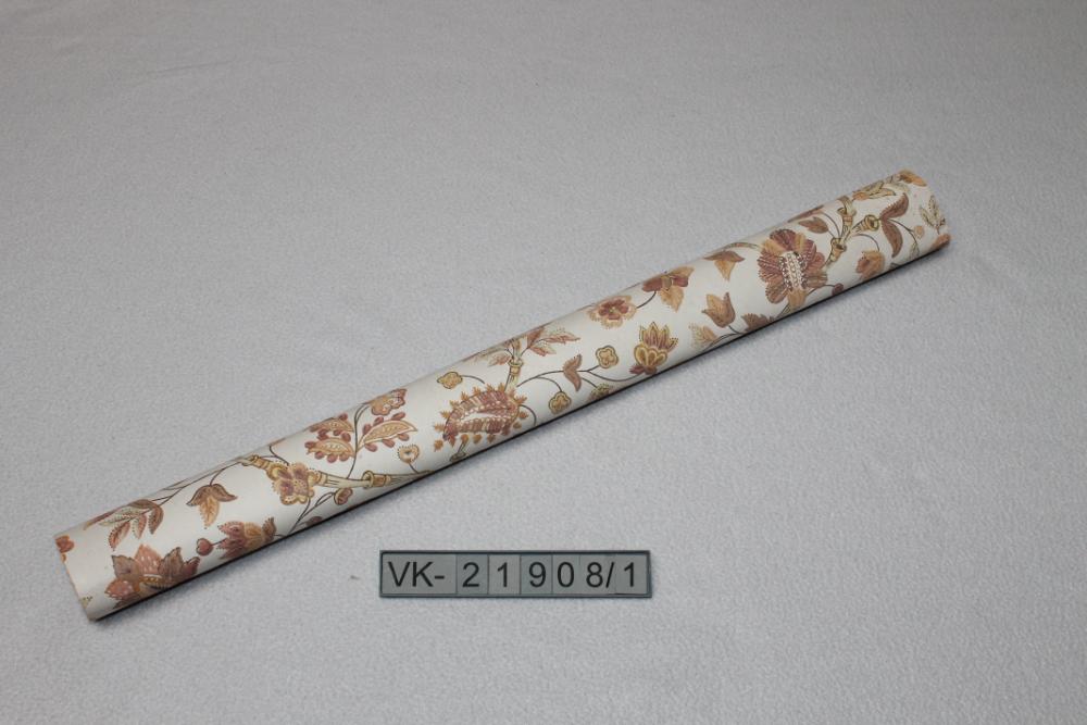 Papiertapete (Rolle), weiß mit floralem Muster in Brauntönen.