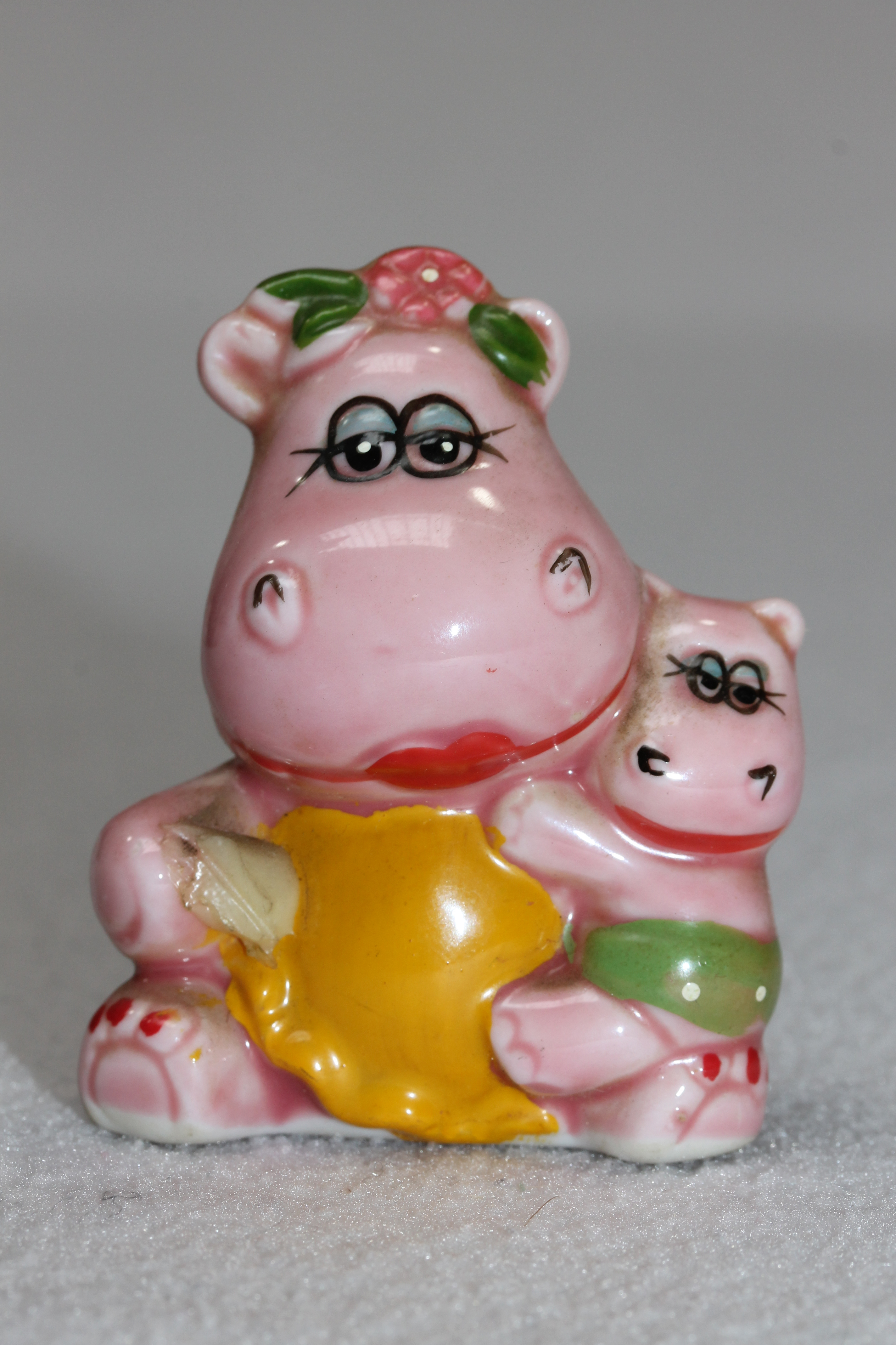 Rosa Keramikfigur, mehrfärbig bemalt: Nilpferdmutter mit Kind. Am Boden befindet sich ein Preisschild: "55---".