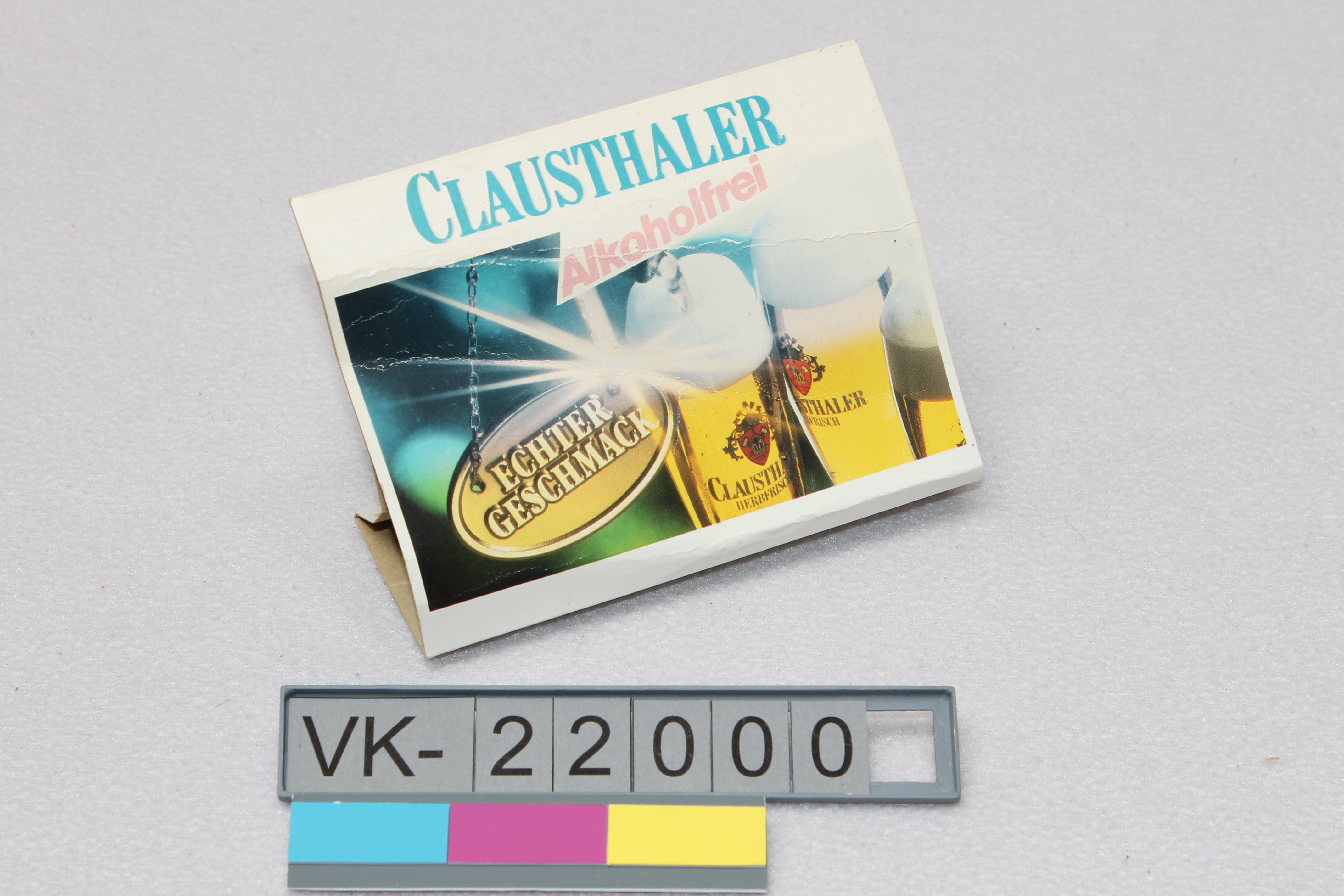 Mehrfärbig bedruckter Werbeaufsteller aus Karton, Abbildung von Biergläsern, Beschriftung: "CLAUSTHALER Alkoholfrei ...".