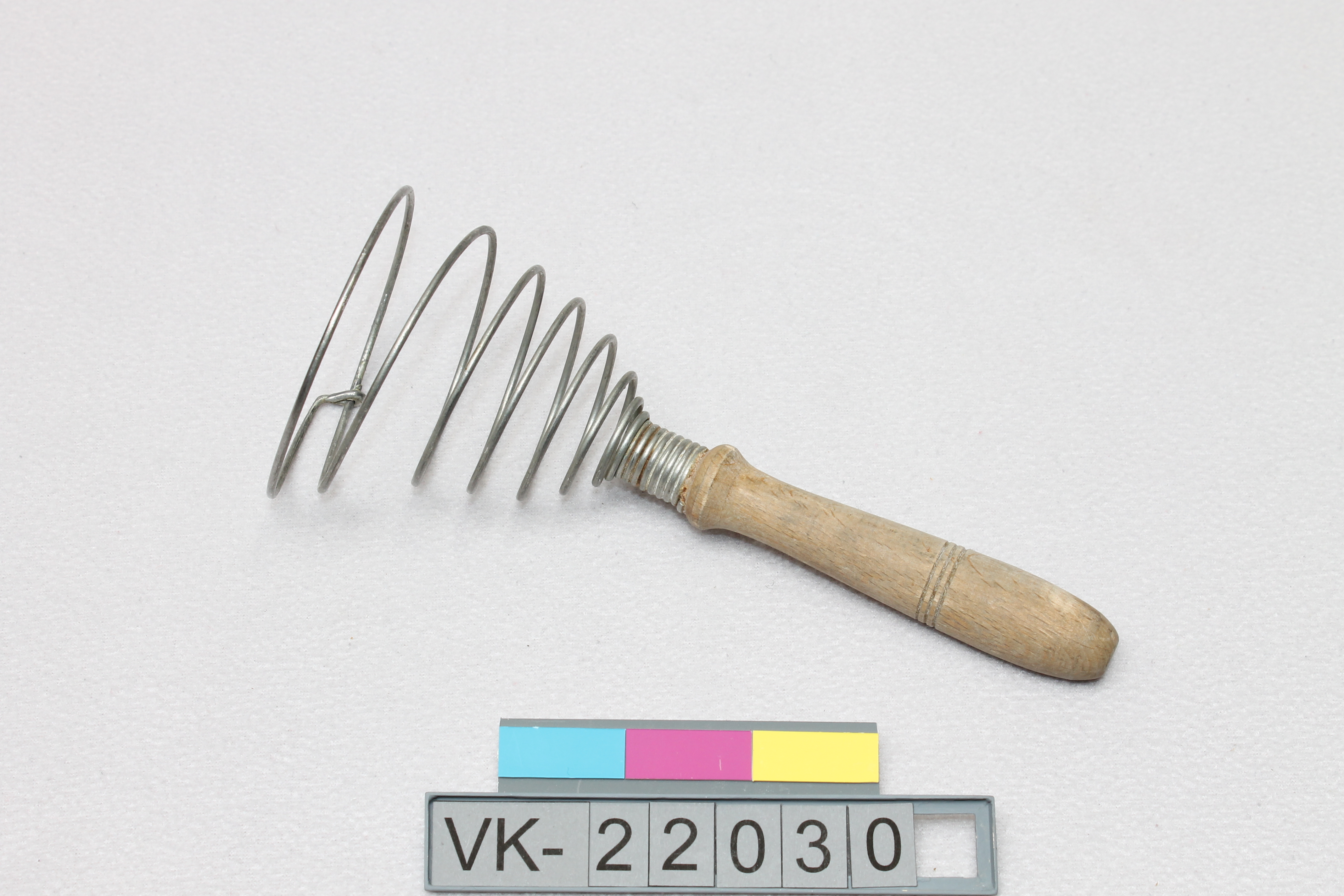 Quirl aus einer konischen Drahtspirale mit einem Holzgriff.
