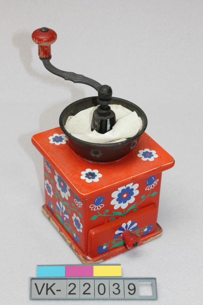 Kaffeemühle mit rot lackiertem Holzgehäuse mit Lade (mit floralem Dekor in blau, weiß und grün bemalt), das Mahlwerk ist schwarz lackiert und hat eine Kurbel mit Holzgriff. Auf der Kurbel ist eine Beschriftung: "R2".