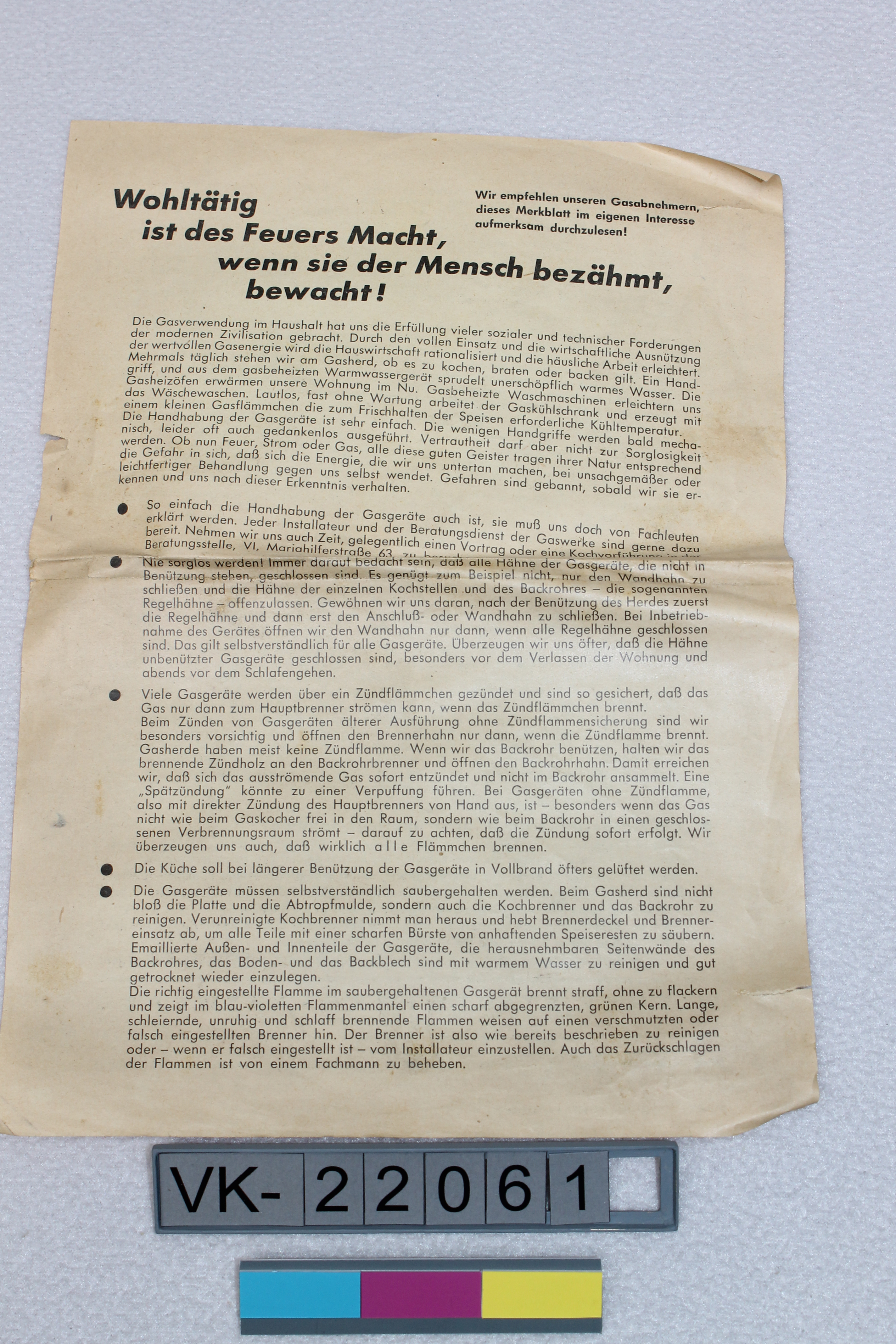 Beidseitig bedrucktes Informationsblatt mit Anweisungen zur sicheren Verwendung von Gasgeräten, herausgegeben von den Wiener Stadtwerken.