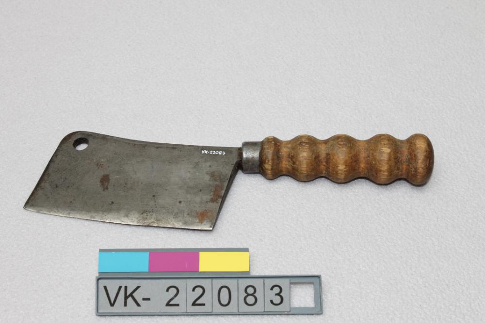 Hackmesser mit annähernd rechteckiger Klinge und einem Holzgriff mit fünf Verdickungen.