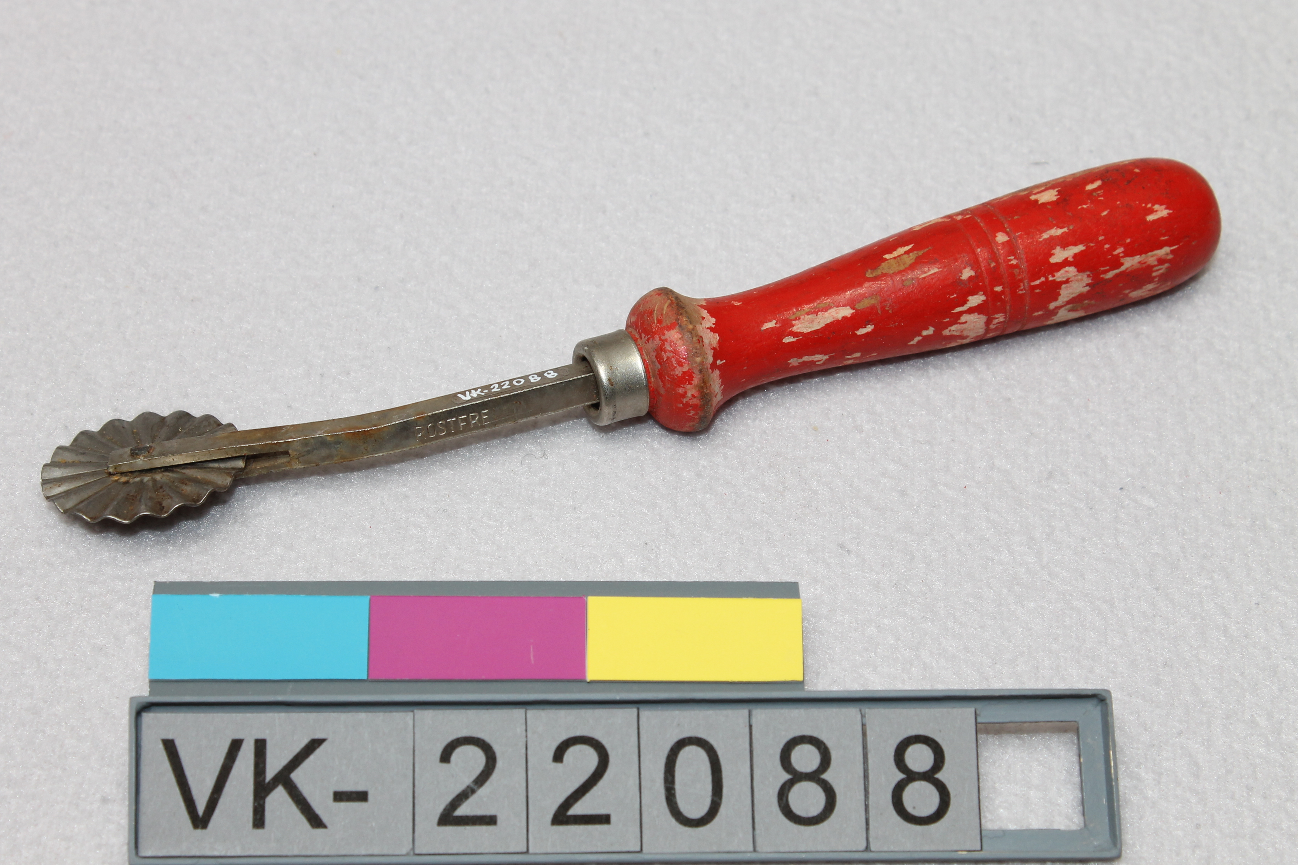 Gewelltes Teigrad in einer vierkantigen Führung mit einem rot lackierten Holzgriff.