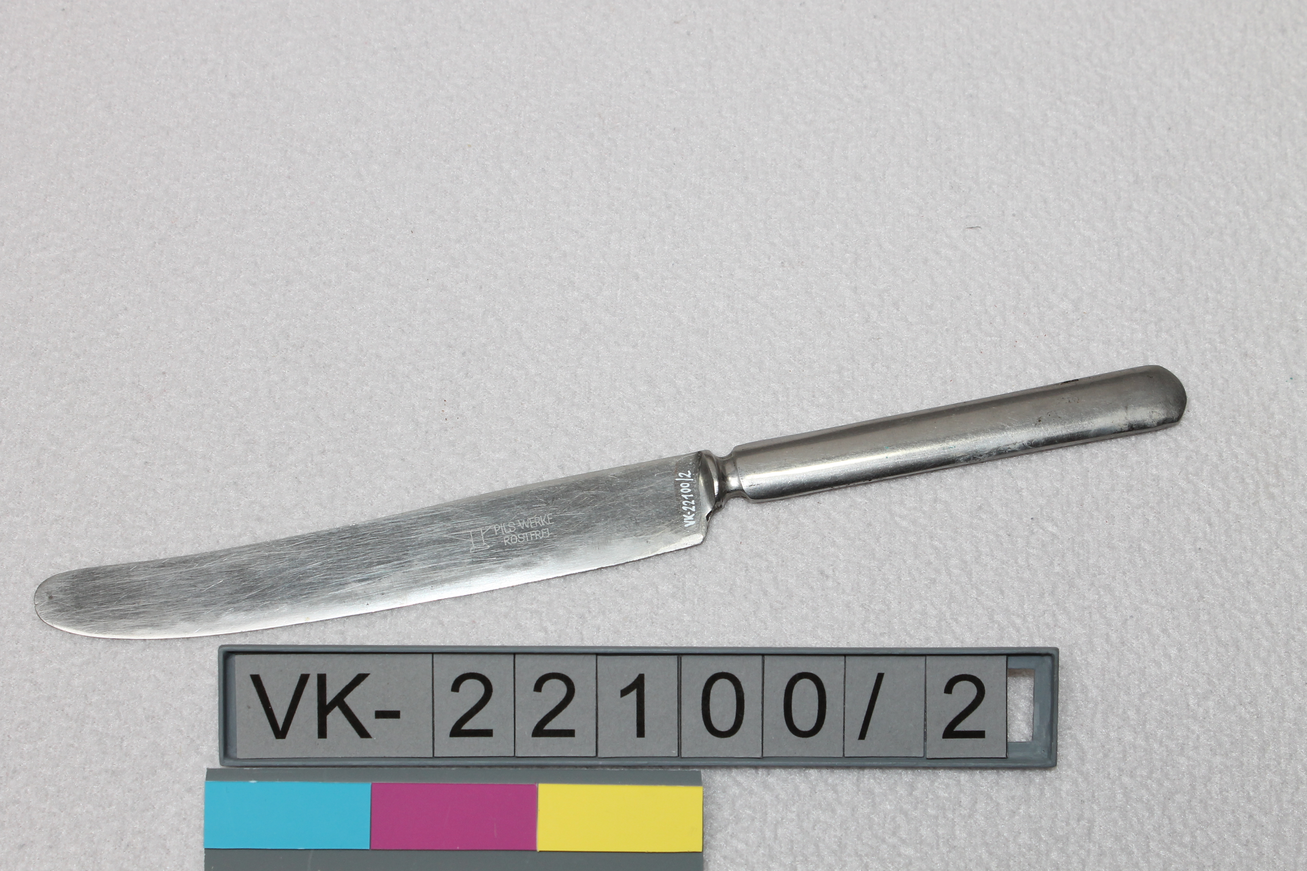 Messer mit abgerundeter Klinge und geradem Griff. Auf der Klinge ist eine Beschriftung: "PILS-WERKE ROSTFREI".