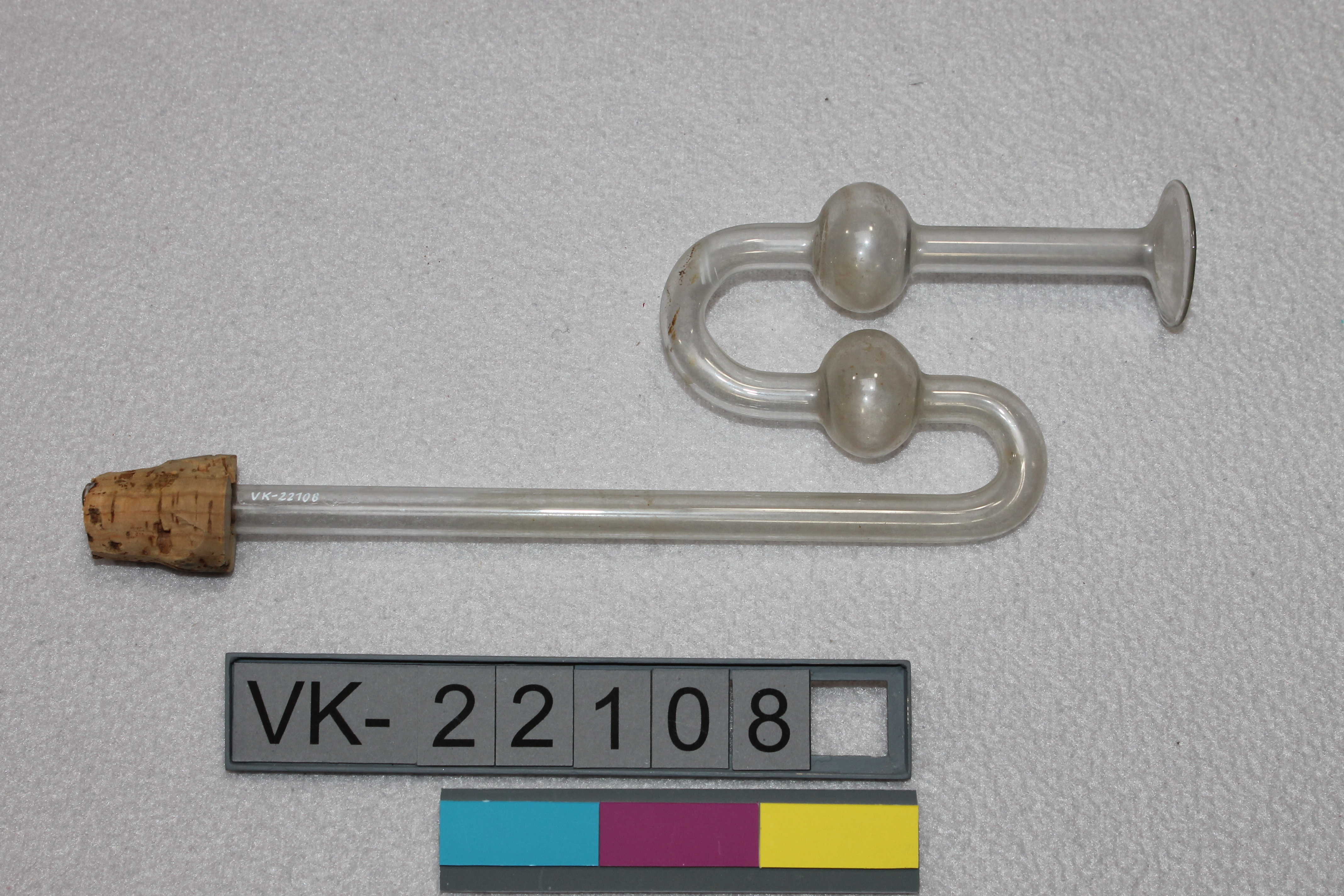 S-förmig gebogenes Gährrohr, das ein gerades und ein trichterförmiges Ende sowie zwei kugelige Erweiterungen im Bereich der Biegung aufweist.