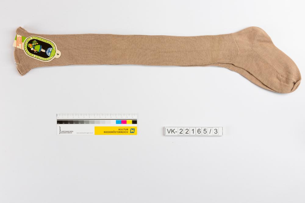 Ein Paar (zusammen gebunden) Kinderstrümpfe, braun mit einem Markenzeichen am Bund: "SCHÜLLERS GRÜNKÄPPCHEN KINDERSTRÜMPFE ...", "DOPPELSOHLE".