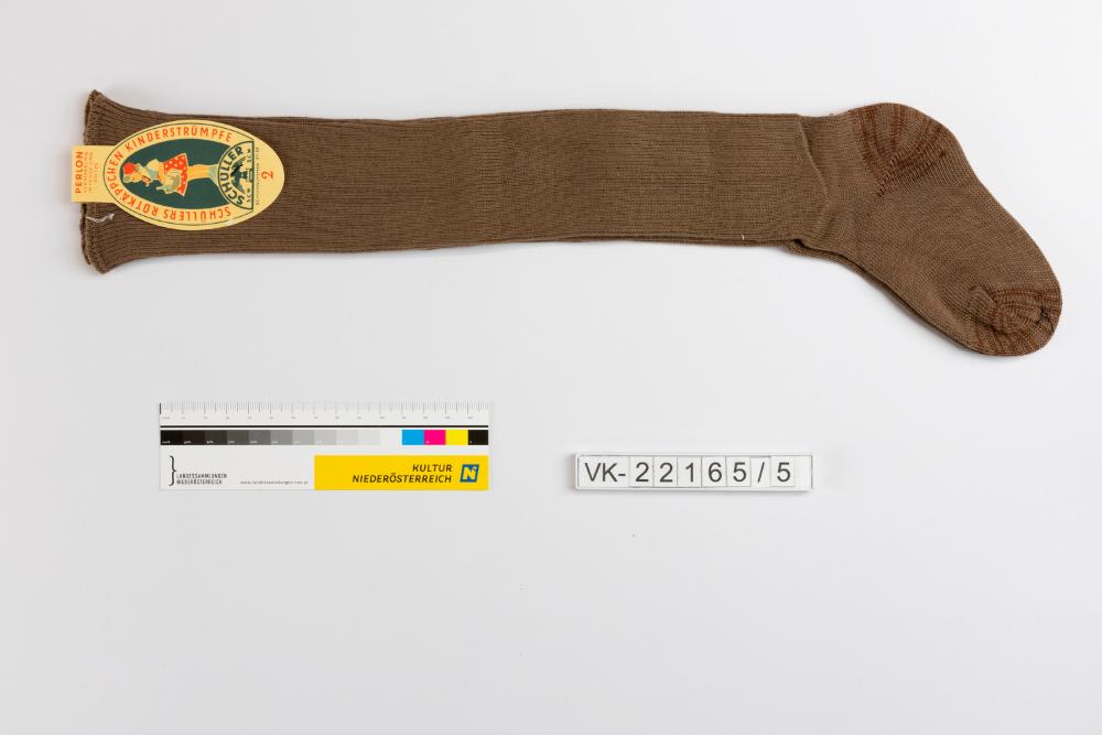 Ein Paar (zusammen gebunden) Kinderstrümpfe, dunkelbraun mit einem Markenzeichen am Bund: "SCHÜLLERS ROTKÄPPCHEN KINDERSTRÜMPFE ...", "PERLON ...".