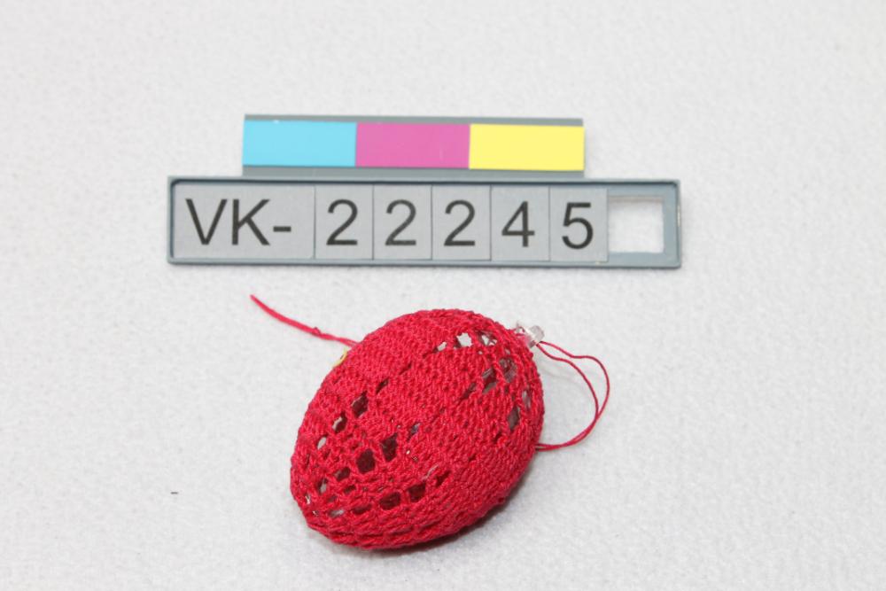 Transparentes Kunststoffei mit einer Öse, mit rotem Garn in durchbrochenem Muster umhäkelt.