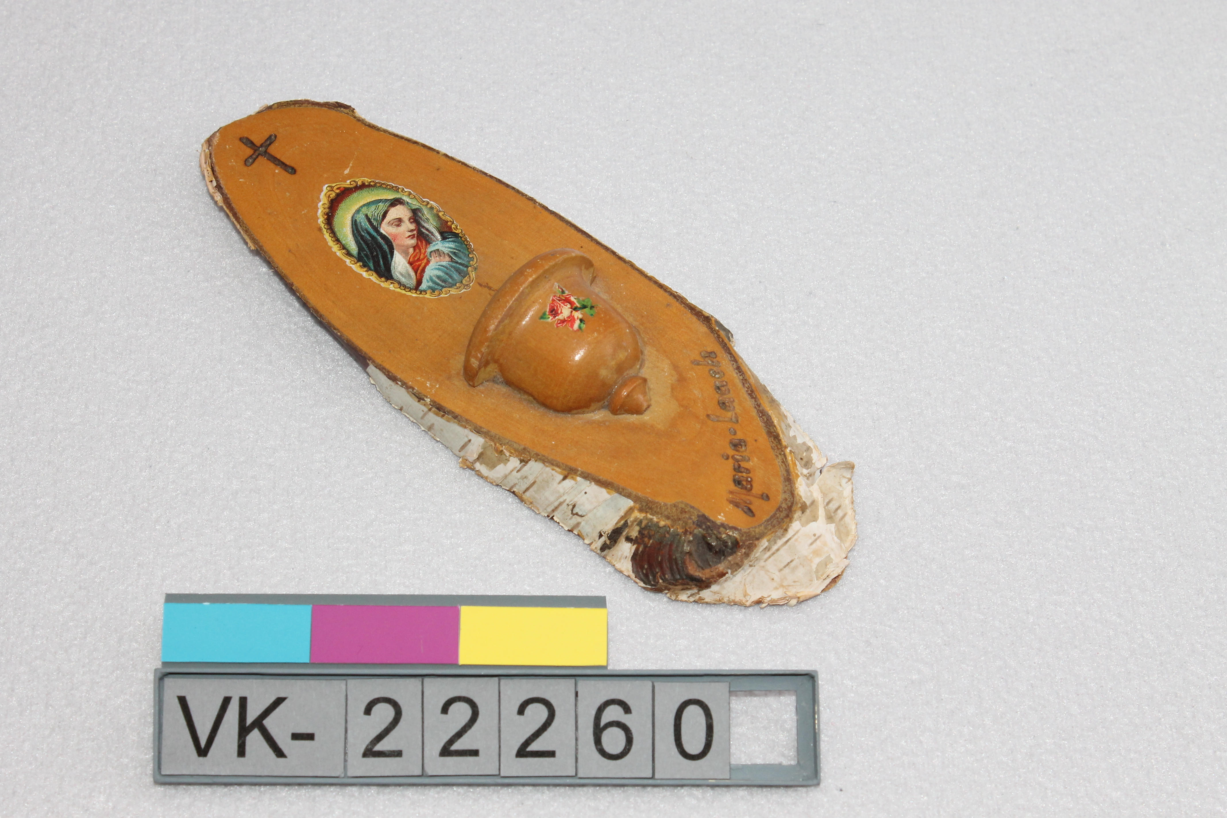 Hölzerner Weihbrunnkessel auf einer Baumscheibe, darauf ein mehrfärbig gedrucktes Marienbild und eine mehrfärbige Rose, eingebrannt: Kreuz, "Maria Laach".