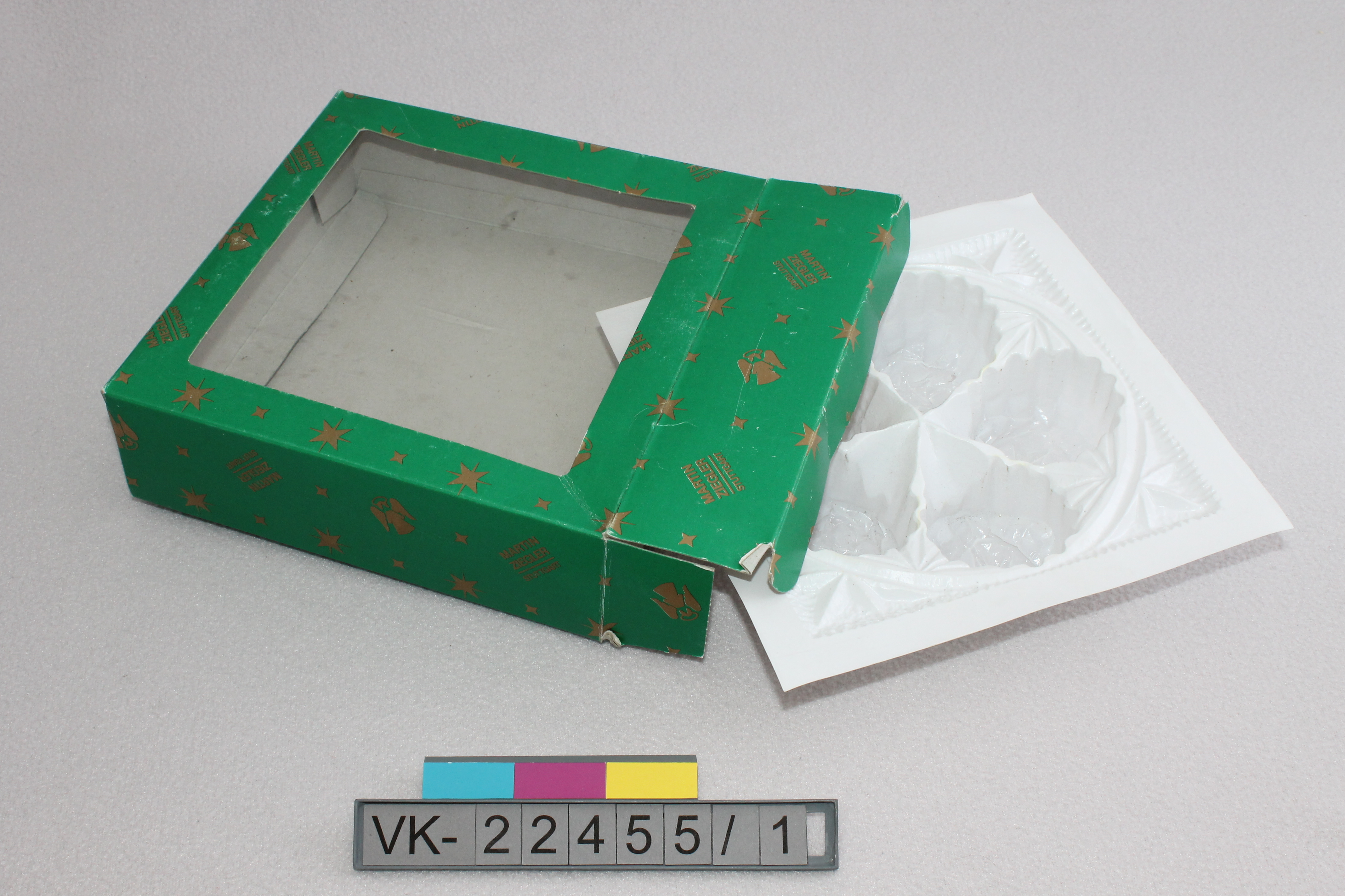 Grüne Schachtel (VK-22455_1a), mit goldenem Muster bedruckt: Sterne, Engel, Herstelleraufdruck: "MARTIN ZIEGLER STUTTGART". Die Schachtel hat einen weißen Kunststoffeinsatz (VK-22455_1b) zur Aufnahme von fünf Glaskugeln.