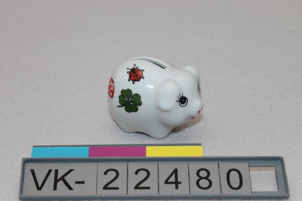 Weißes Sparschweinchen, stilisierte Form, bedruckt mit diversen Glückssymbolen und "Viel Glück".