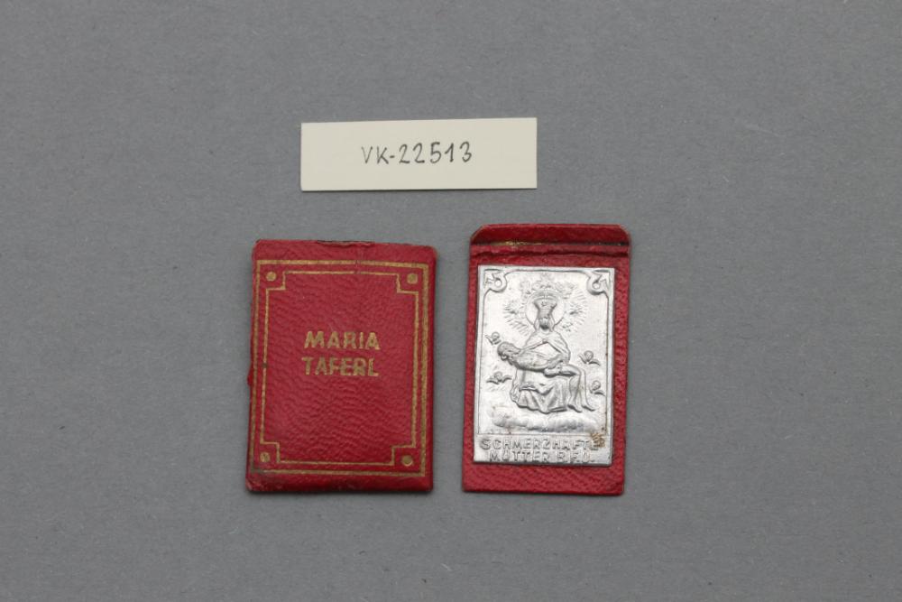 Kleine Blechtafel, geprägt mit Gnadenbild und Beschriftung: "SCHMERZHAFTE MUTTER B. F. U." auf strukurgeprägtem rotem Karton, auf der Rückseite mit einem goldenen Aufdruck: "UNTER DEINEM SCHUTZ". Das Bildchen hat eine Aufbewahrungstasche aus rotem strukturgeprägtem Karton mit Aufdruck: "MARIA TAFERL".