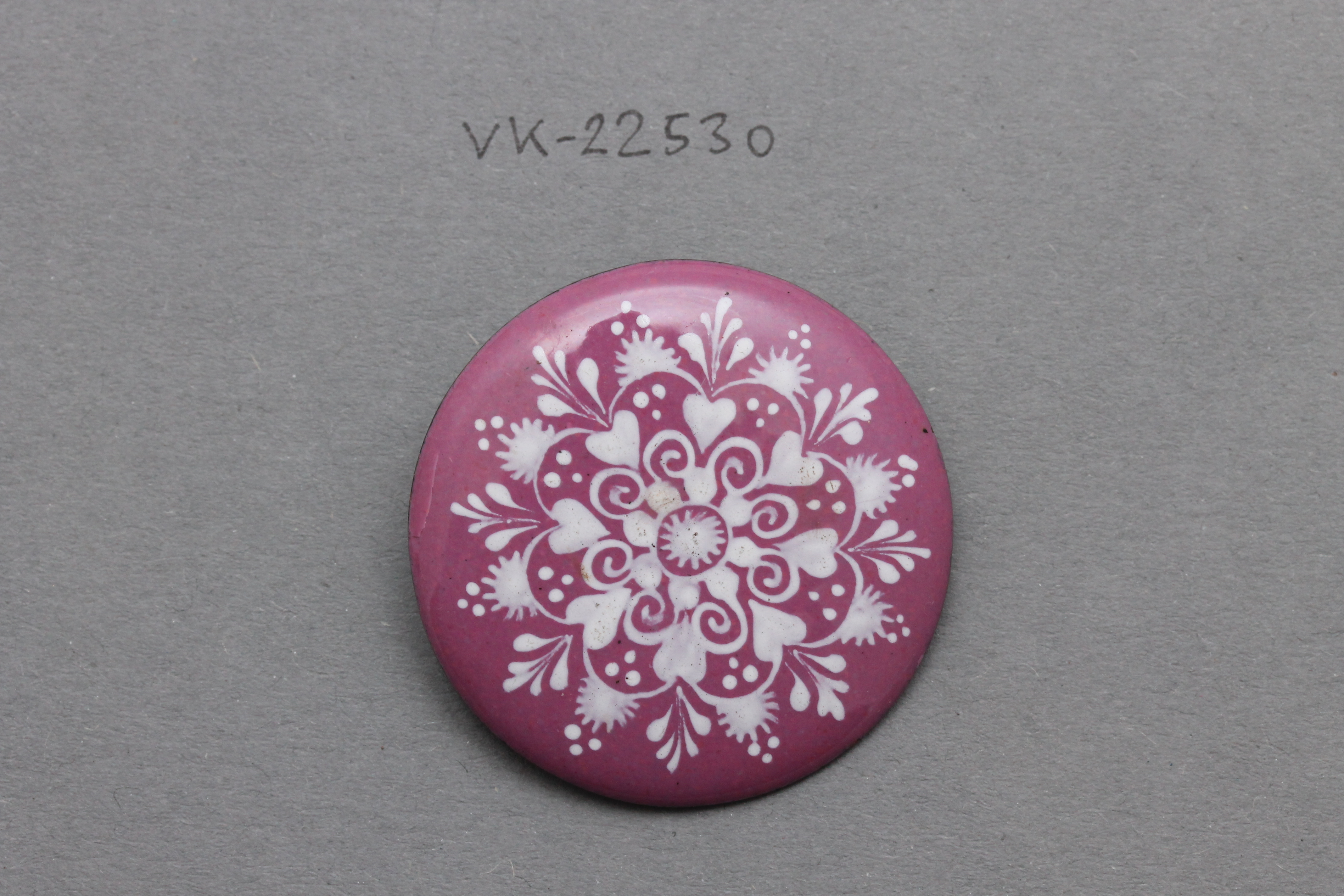 Brosche aus einer runden Blechscheibe, an der Vorderseite rosa mit weißem ornamentalem Motiv, an der Rückseite blau gesprenkelt, mit aufgeklebter Anstecknadel.