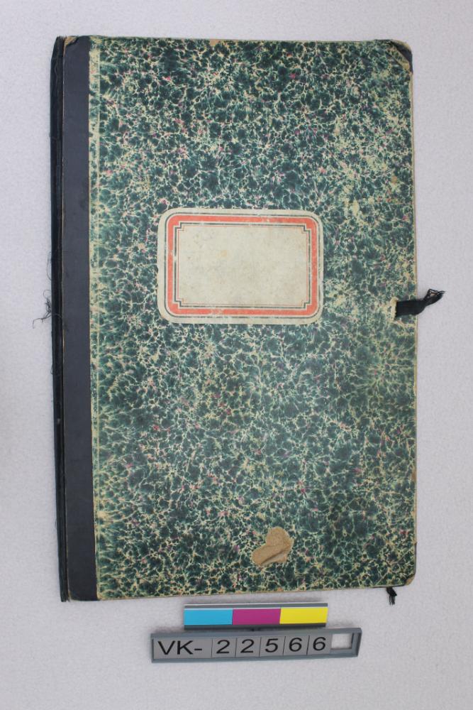 Grün marmorierte Karonmappe mit schwarzem Bändchen zum Binden und einem Schildchen mit rotem Rahmen. Die Innenseiten sind hellblau. In der Mappe befinden sich die Objekte VK-22567 bis VK-22579.