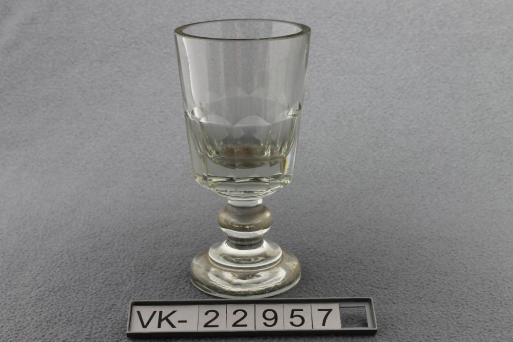 Konisches Weinglas, etwa die untere Hälfte ist geschliffen, das Glas hat einen runden Fuß mit einer Stufe.