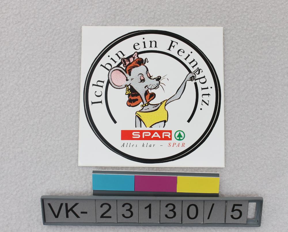 Werbeaufkleber für Spar mit der Darstellung einer Maus als Dame mit Käse-Ohrhängern, darüber im Halbkreis: "Ich bin ein Feinspitz.". Auf der Rückseite die Herstellermarke der Folie: "INERCOAT P".