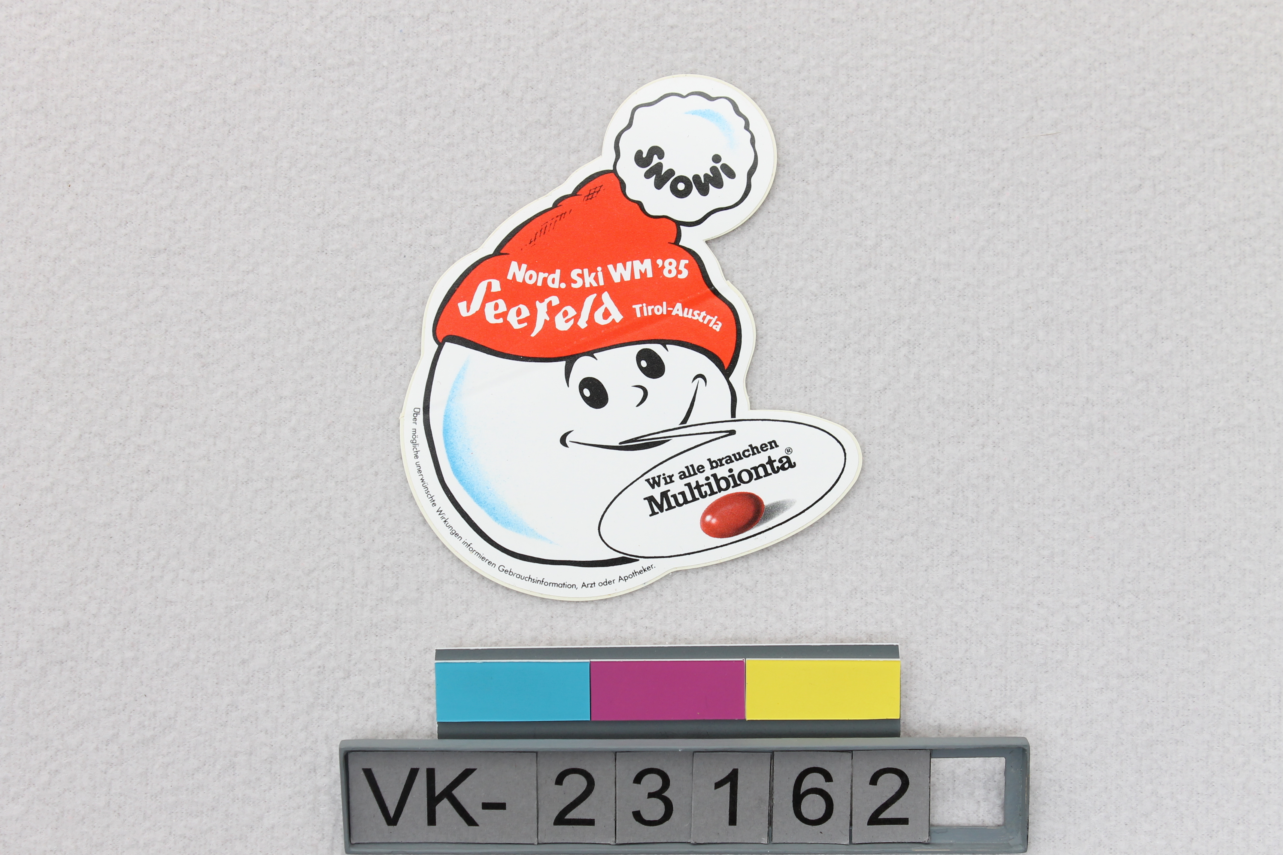 Werbeaufkleber zur Schiweltmeisterschaft 1985 in Seefeld, gestaltet als Schneemannkopf mit Mütze, mit Sprechblase: "Wrr alle brauchen Multibionta". Auf der Rückseite die Herstellermarke der Folie: "jac".