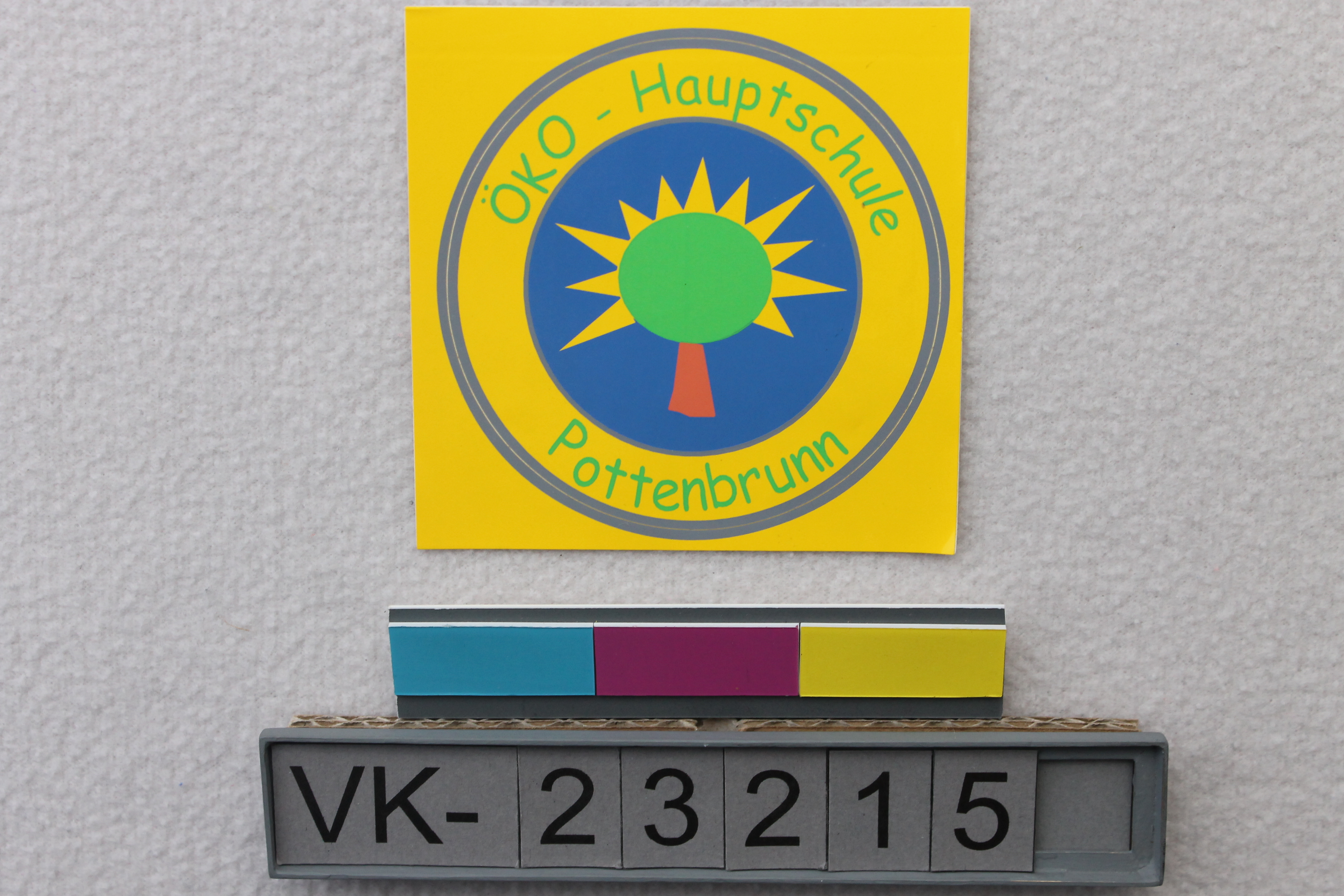 Runder Aufkleber mit grüner Beschriftung und einem stilisierten Baumsymbol: "ÖKO-Hauptschule Pottenbrunn". Auf der Rückseite die Herstellermarke der Folie: "P INTERCOAT".