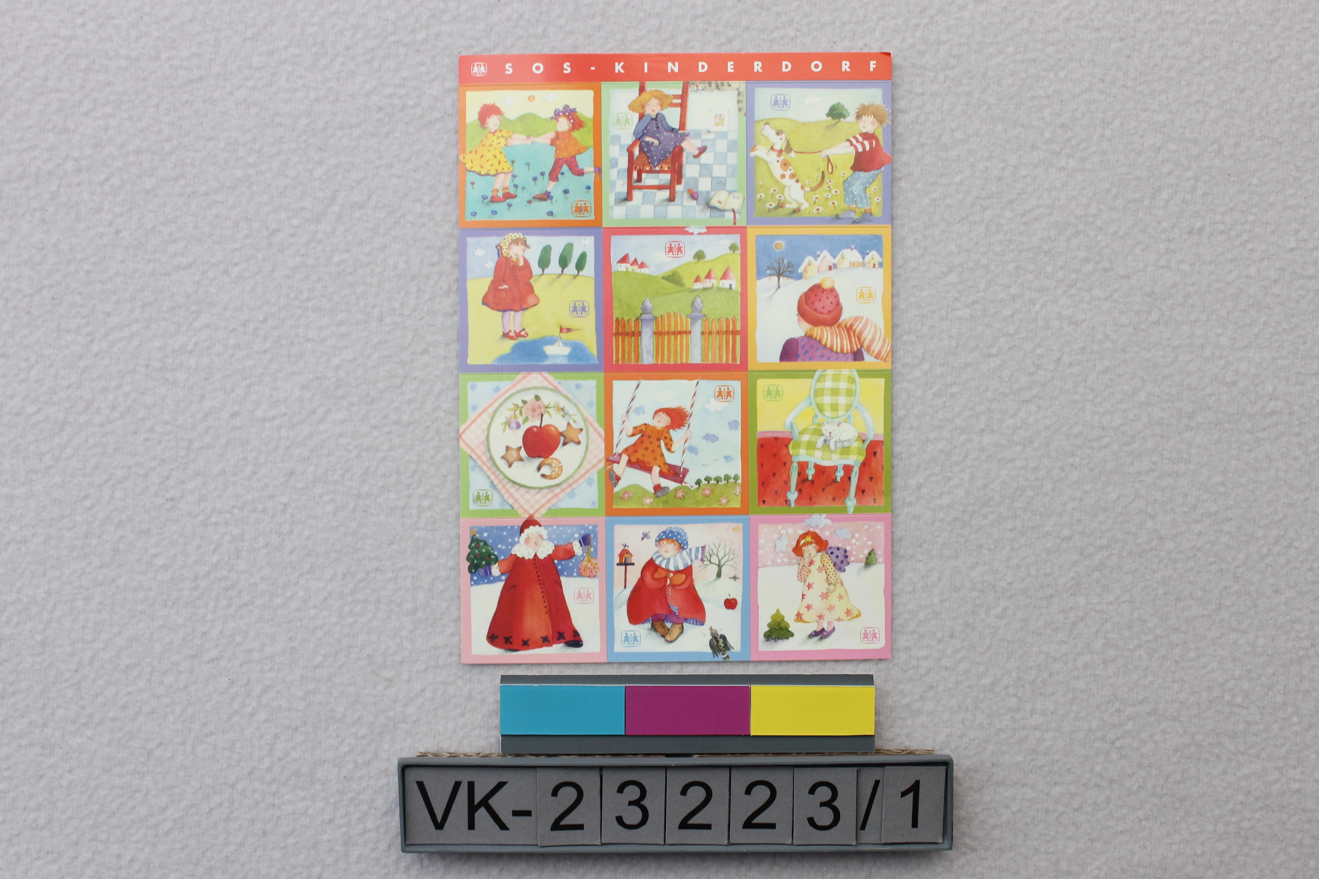Aufklebersatz mit zwölf kleinen Aufklebern auf einer Postkarte mit geteilter Adressseite, Beschriftung: "SOS-KINDERDORF".