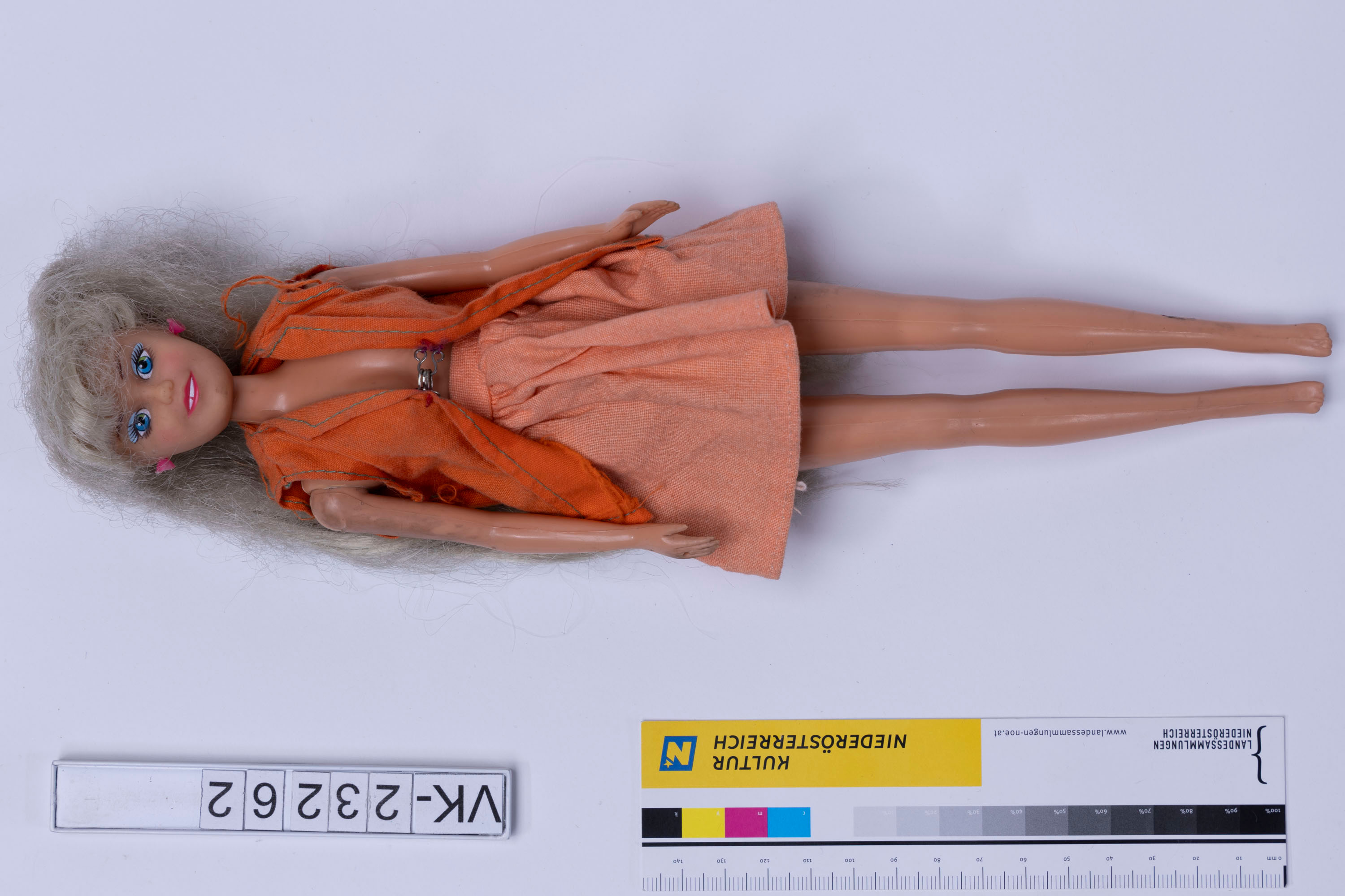 Frauenpuppe mit aschblonden Haaren, blauen Augen und rosa Ohrschmuck. Die Puppe hat bewegliche Arme und Beine und ist mit einem orangen Rock und einer orangen Weste bekleidet, die vermutlich nicht im Lieferumfang waren, sondern selbst angefertigt wurden. Das Objekt befindet sich auf dem Restaurierungstisch.