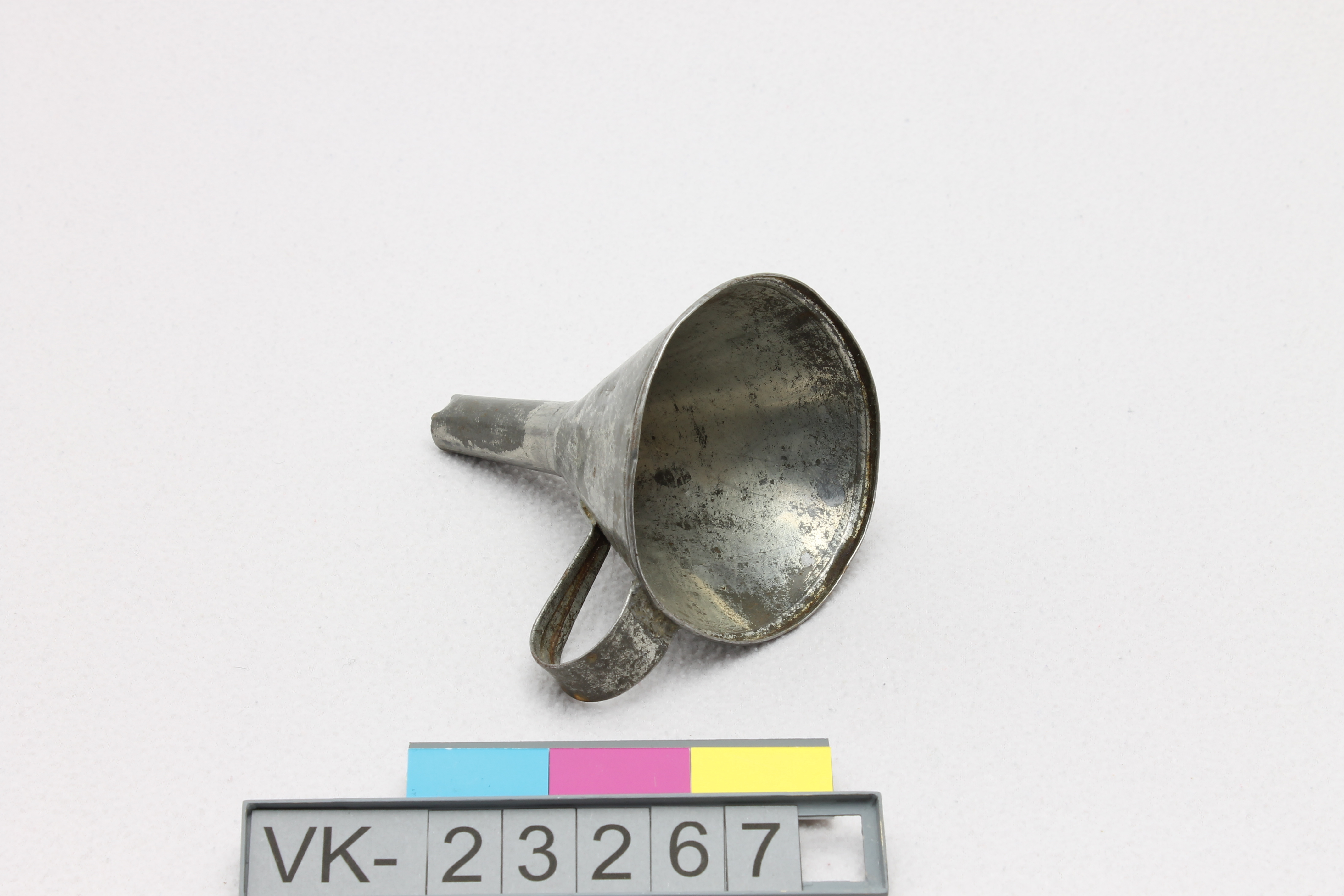 Kleiner Trichter aus Eisenblech mit einem randständigen Henkel.