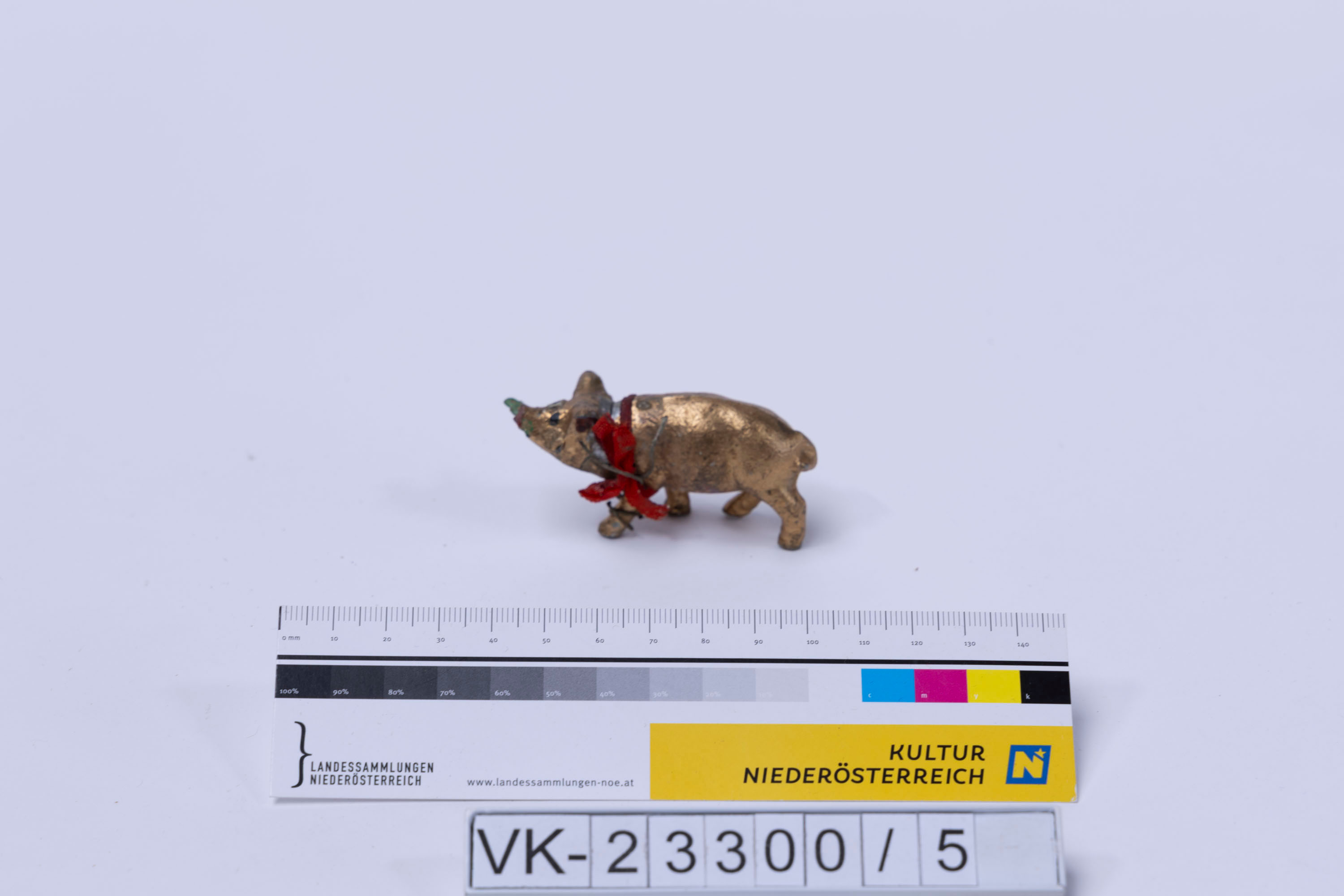 Metallschweinchen, mit Goldfarbe bemalt. Das Schweinchen hat ein angeformtes Kleeblatt am Rüssel und eine rote Schleife um den Körper gebunden. Das Objekt befindet sich auf dem Restaurierungstisch.