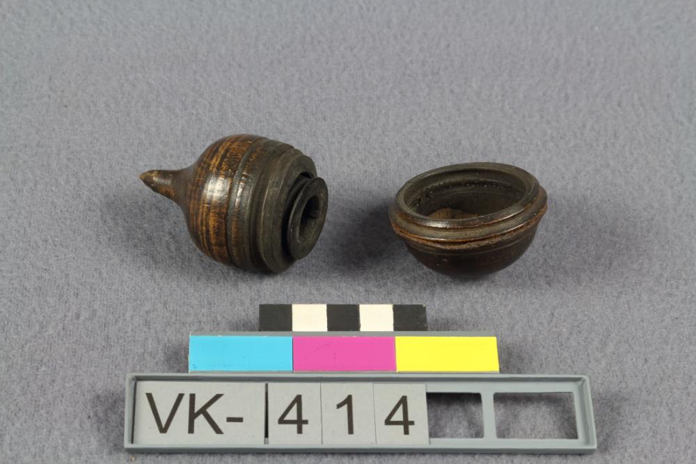 Kleines Reisetintenfass aus Holz mit Dorn an der Unterseite, einem Verschlussdeckel und einem Glaseinsatz.