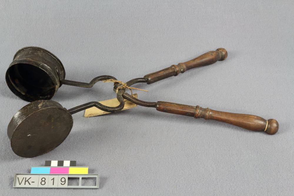 Backgerät mit Pfännchen und Deckel, verbunden über einen Scherenmechanismus mit Holzgriffen, ev. für Oblaten.