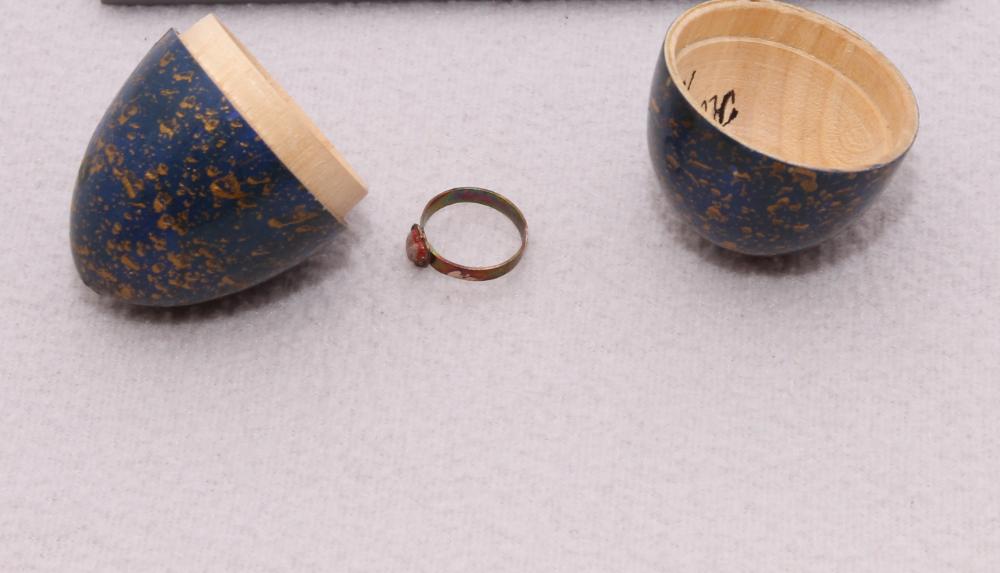 Holzei, teilbar (a, b) mit Ring (c). Das Ei ist außen dunkelblau lackiert und mit goldfarbenen Sprenkeln verziert. In dem Ei befindet sich ein Metallring mit einem kleinen Zierelement.