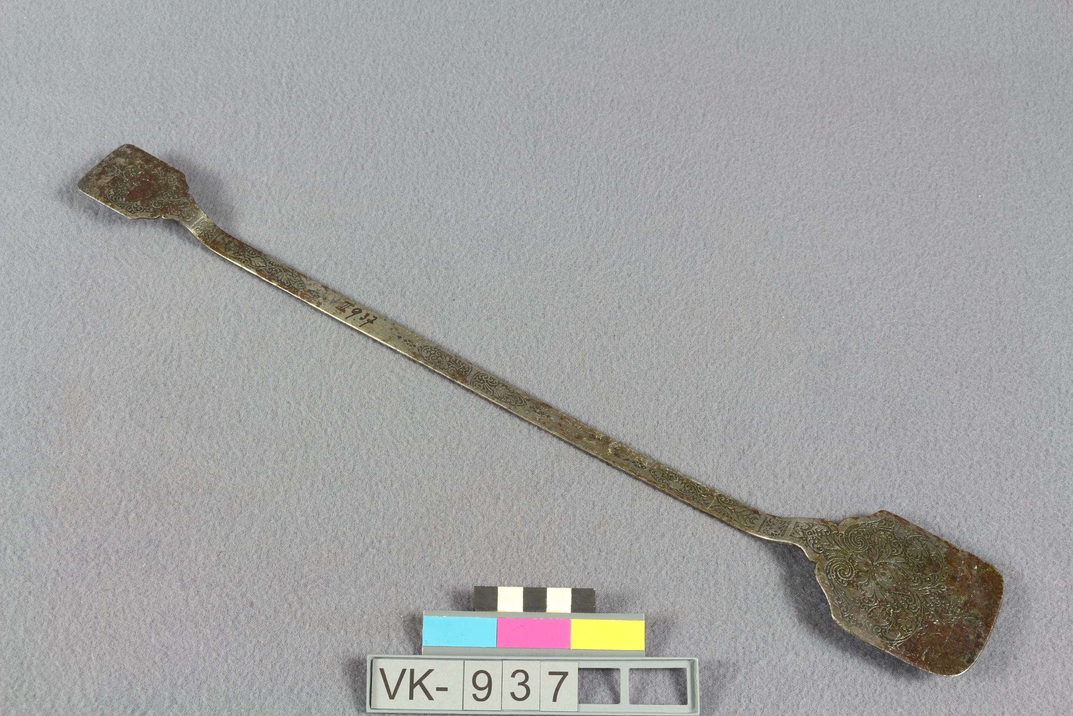 "Schmarrenschäuferl" (Kochlöffel) mit großflächiger ornamentaler Verzierung und zwei unterschiedlich großen flachen Laffen.