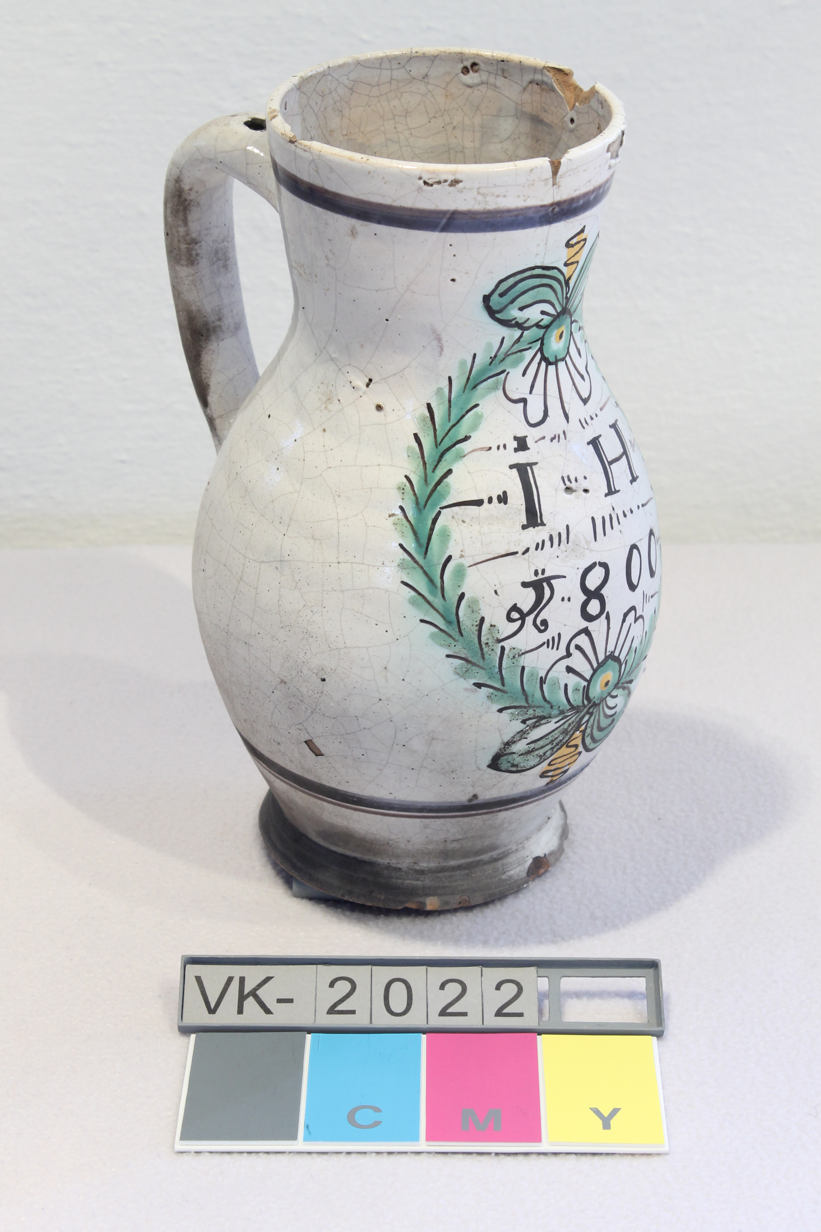 Birnkrug: Bauchiger Krug mit halsständigem Henkel, weiß glasiert. Der Krug ist mit einer Beschriftung: "I H 1800" in einem grünen Kranz mit Schleifen bemalt. Darüber und darunter manganfarbene Linien.