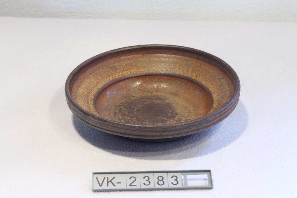 Tiefer Teller mit hohem Rand und steil verlaufender Fahne, glasiert in Brauntönen mit Wellenmuster auf der Fahne.