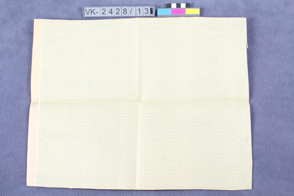 Rechteckiges ausgeschnittenes Stück einer Tapete. Muster: Feines, grünes, gepunktetes Karomuster.