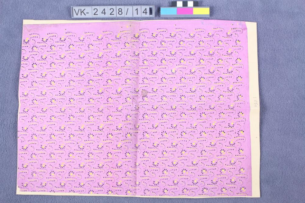 Rechteckiges ausgeschnittenes Stück einer Tapete. Muster: Gepunktete Wellenlinien in gelb und schwarz mit kleinen Blütenelementen auf violetter Grundfarbe. Ähnlich wie VK-2428_30, VK-2425_5 und VK-2425_7.