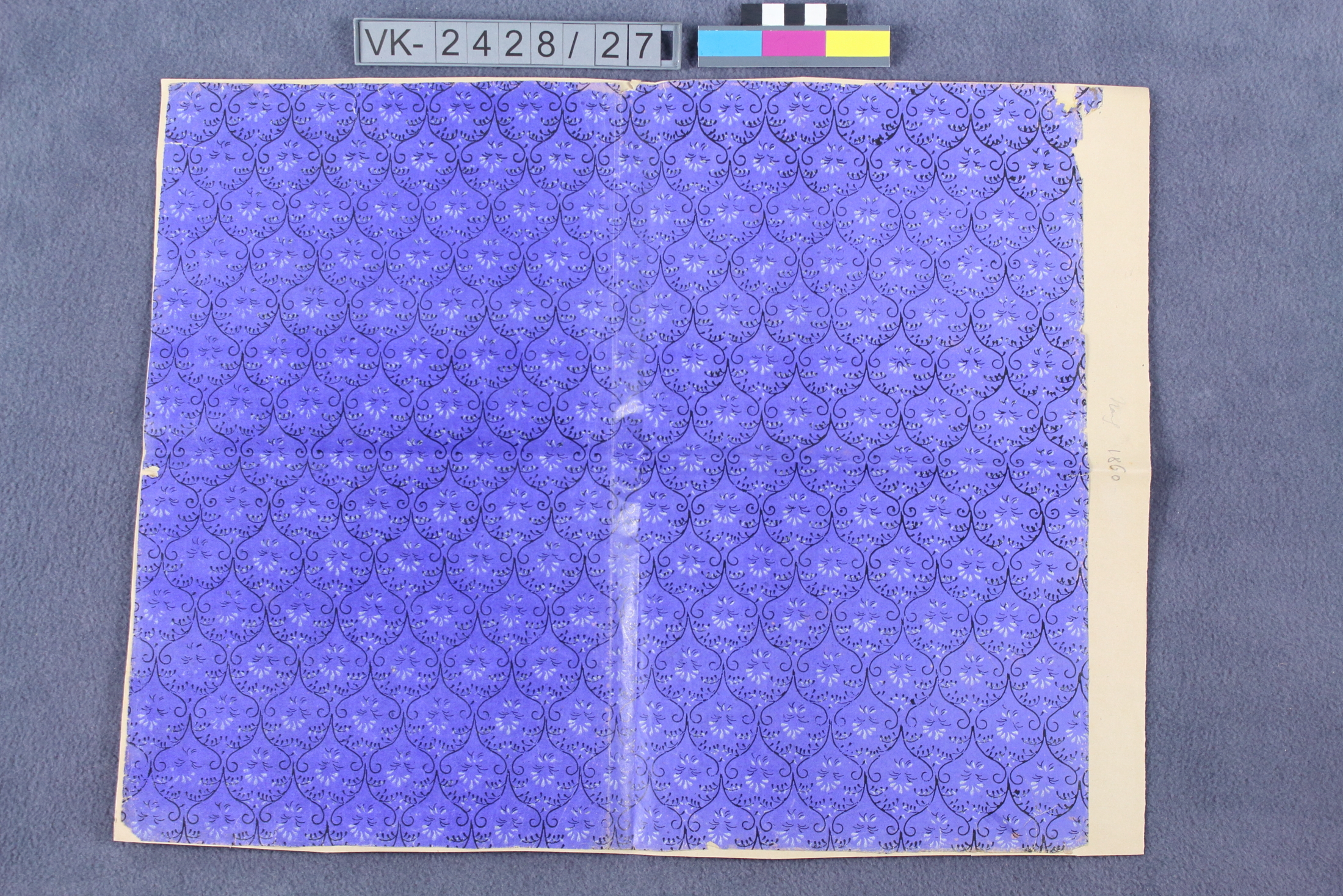 Rechteckiges ausgeschnittenes Stück einer Tapete. Muster: Schwarzes Gitter aus geschwungenen Linien, darin kleine weiße Blüten auf violetter Grundfarbe. Wie VK-2451_2.