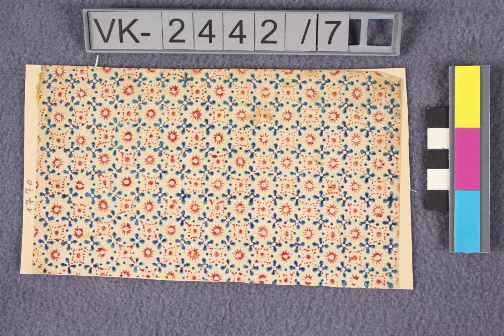 Rechteckiges ausgeschnittenes Stück einer Tapete. Muster: Rote Stern- und blaue Vierpasselemente mit roten Pünktchen dazwischen. Ähnlich wie VK-2448_2.