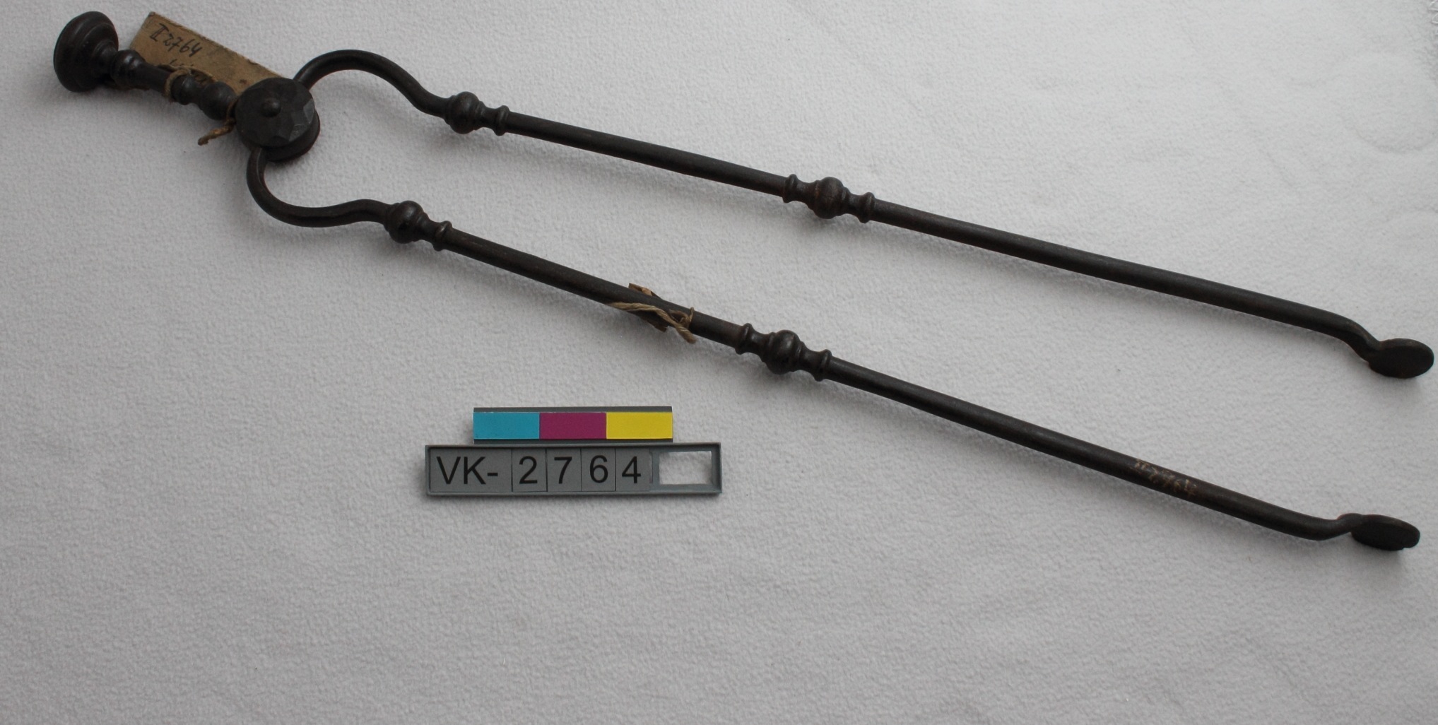 Feuerzange aus Rundstäben mit Wulstverzierungen und einem Griff.
