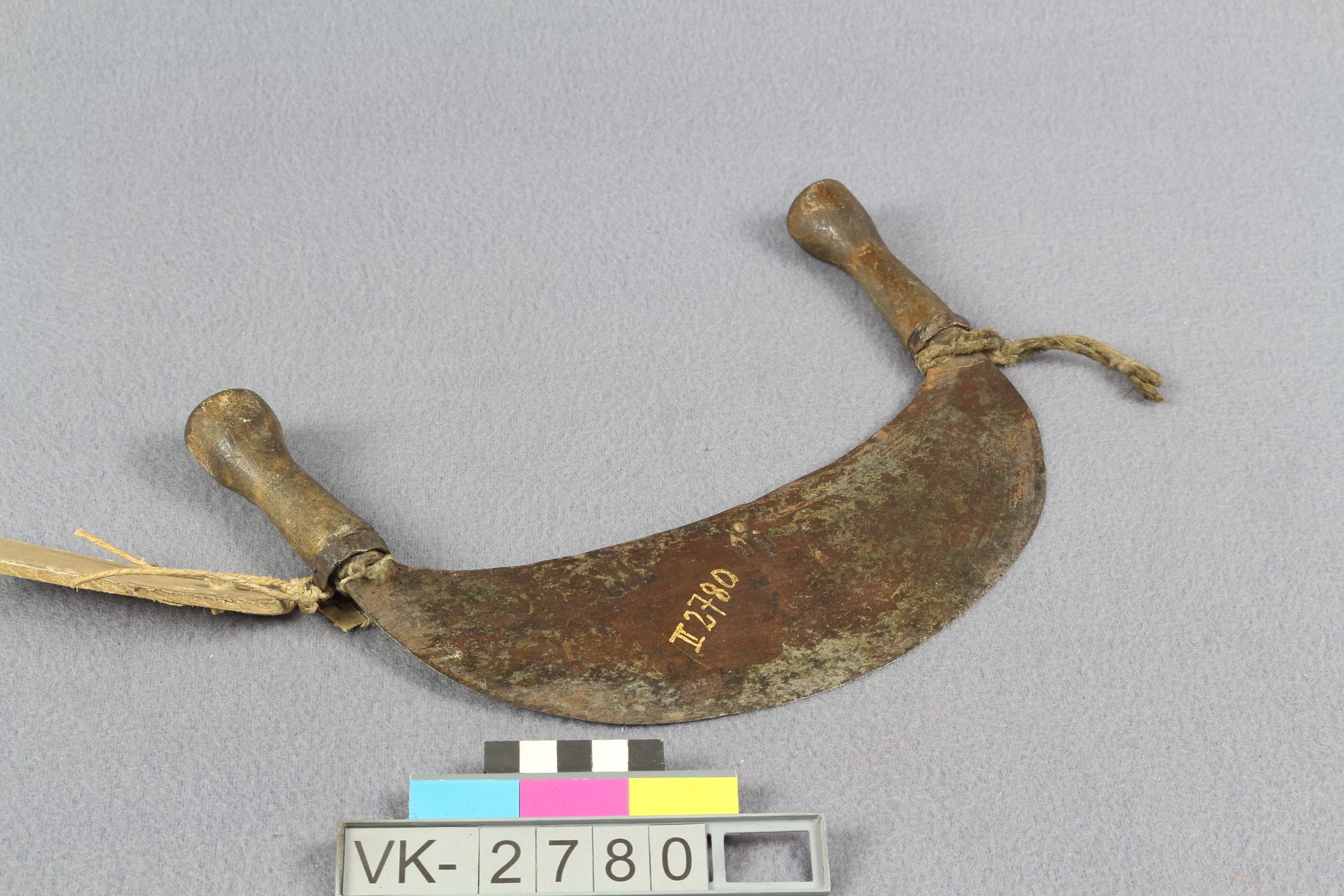 Wiegemesser mit halbmondförmiger Klinge und zwei Holzgriffen.