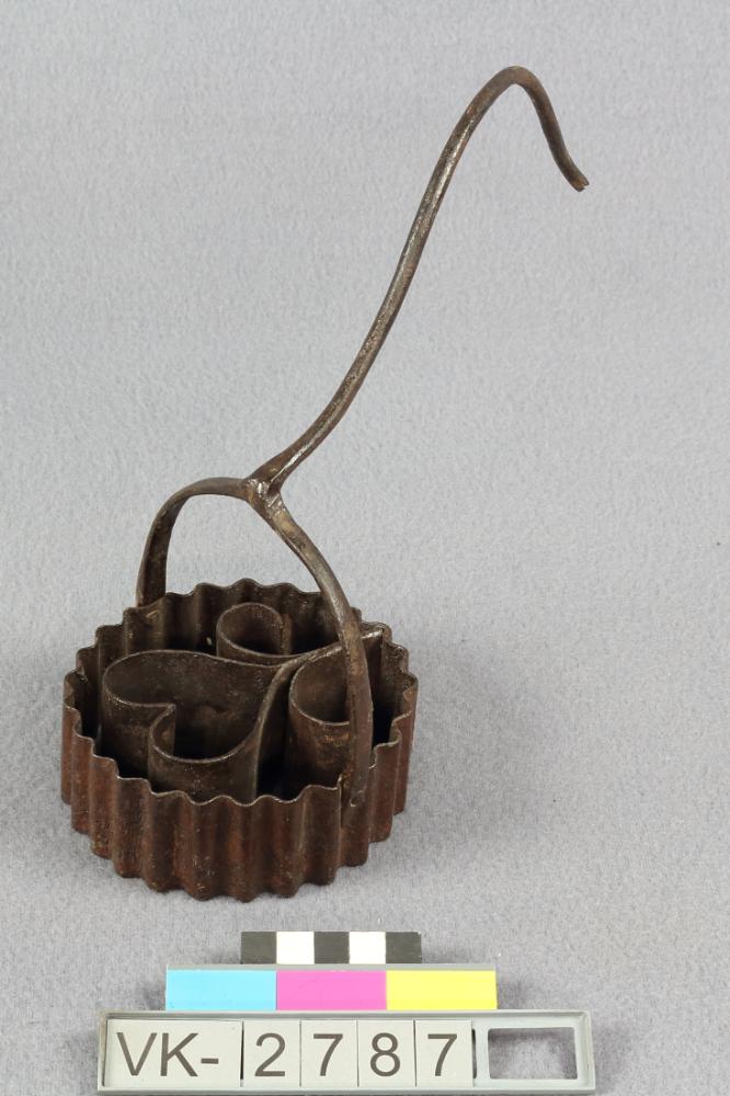 Runder Krapfenstecher mit gebogenem Stiel, Wellrand und einem floralen Herzelement an der Innenseite.