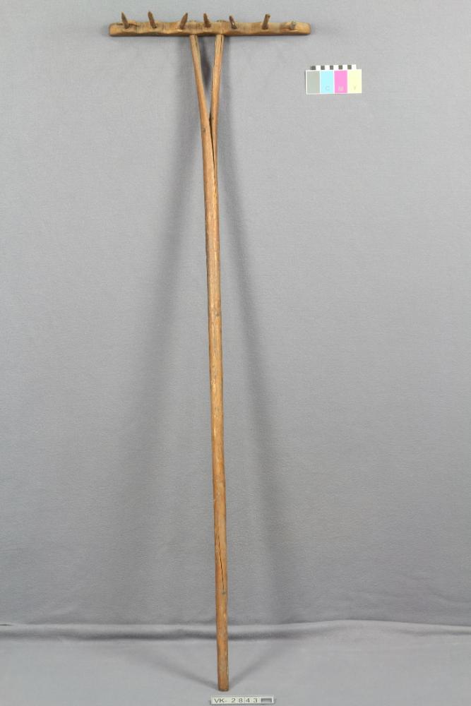Holzrechen mit sieben Zähnen und gegabeltem Stiel.