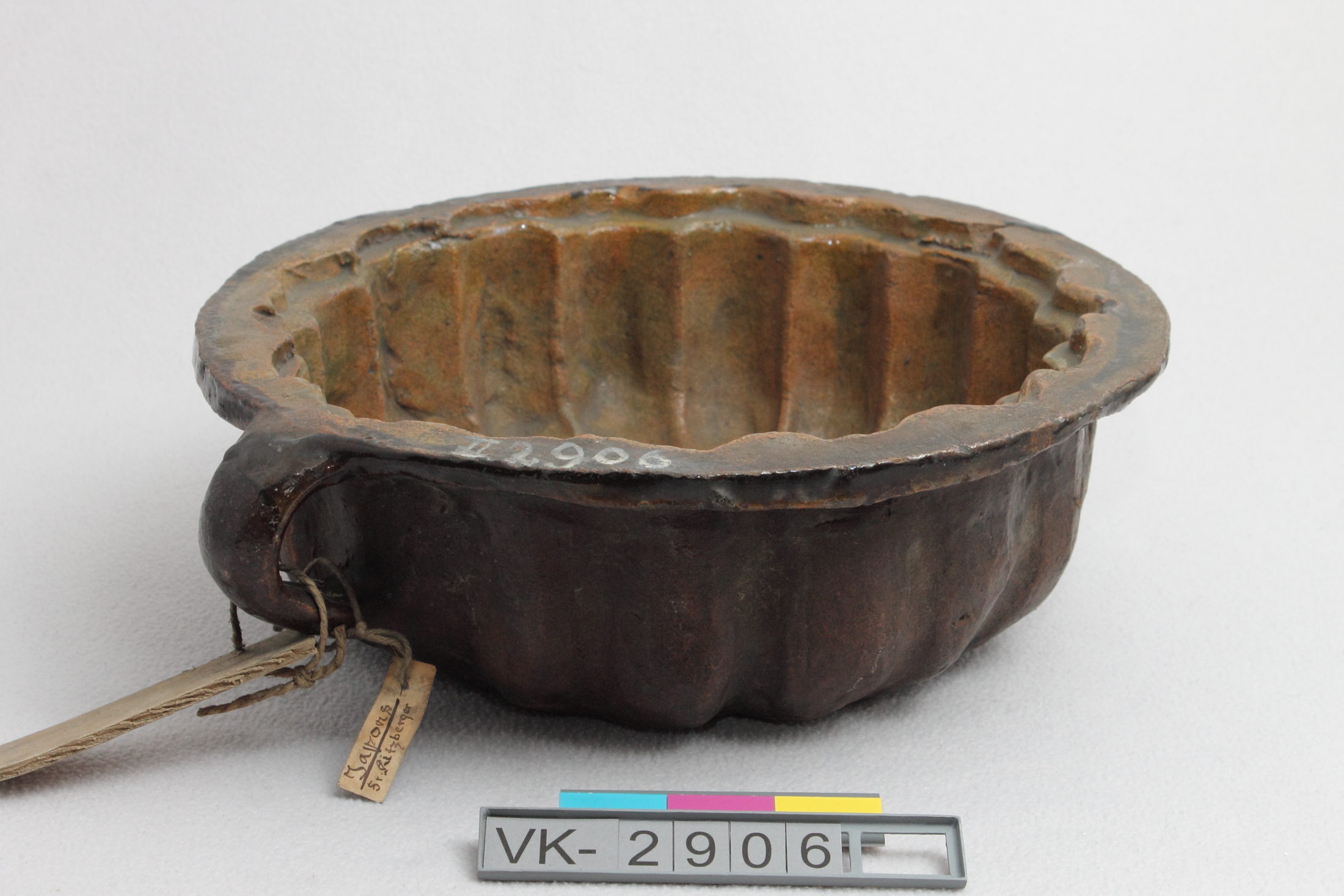 Runde Backform mit senkrechter Profilierung, innen hellbraun und außen dunkelbraun glasiert, mit einem Henkel.