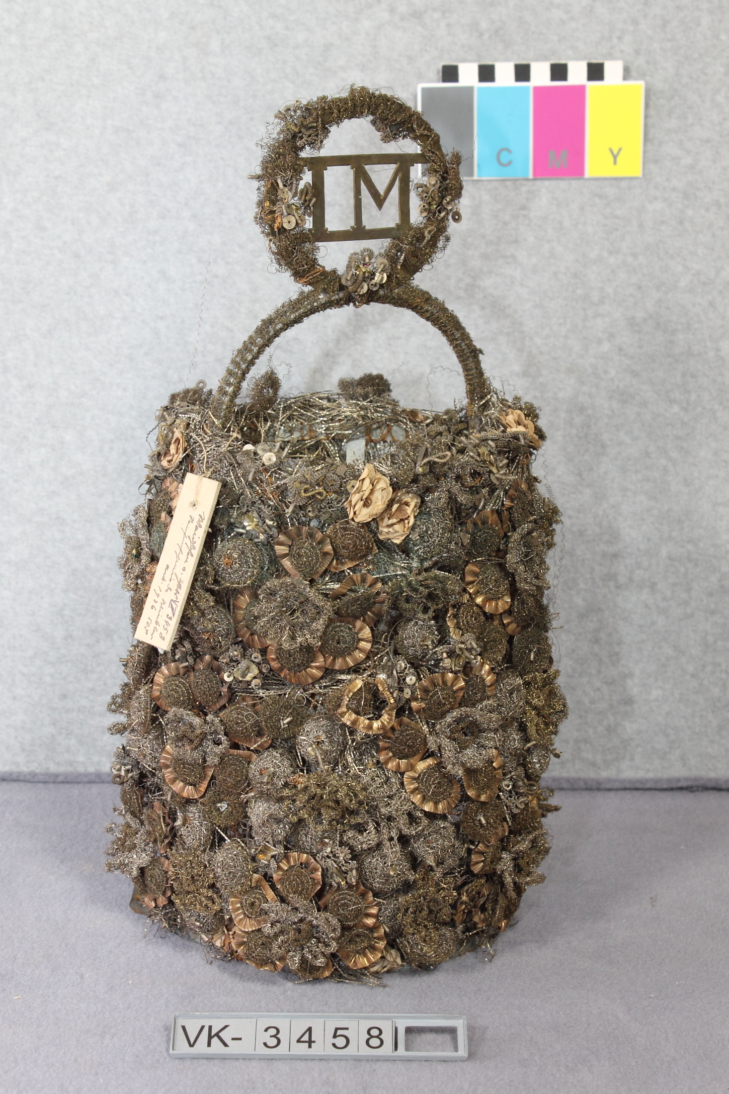Totenkrone für verstorbene Jungfrauen, zylindrisch mit Bogenaufsatz, darin ausgeschnittene Initialen "MI" oder "IM"; die Totenkrone ist vollflächig mit Chenille- und Blechrosettenelementen gestaltet.
